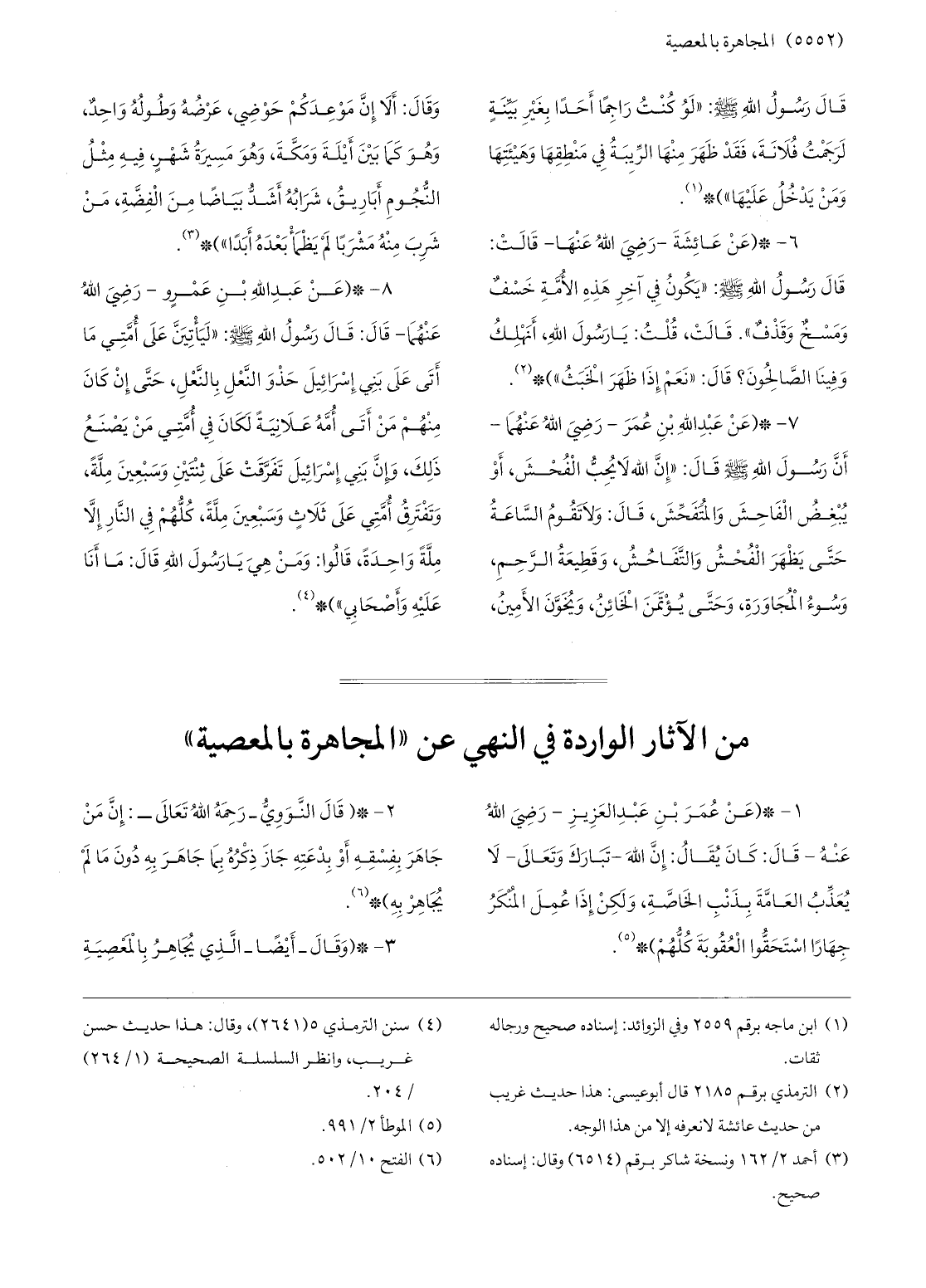 1-* (عن عمر بن عبد العزيز- رضي الله عنه- قال: كان يقال: إنّ الله- تبارك وتعالى- لا يعذّب العامّة بذنب الخاصّة، ولكن إذا عمل المنكر جهارا استحقّوا العقوبة كلّهم) * «5» .