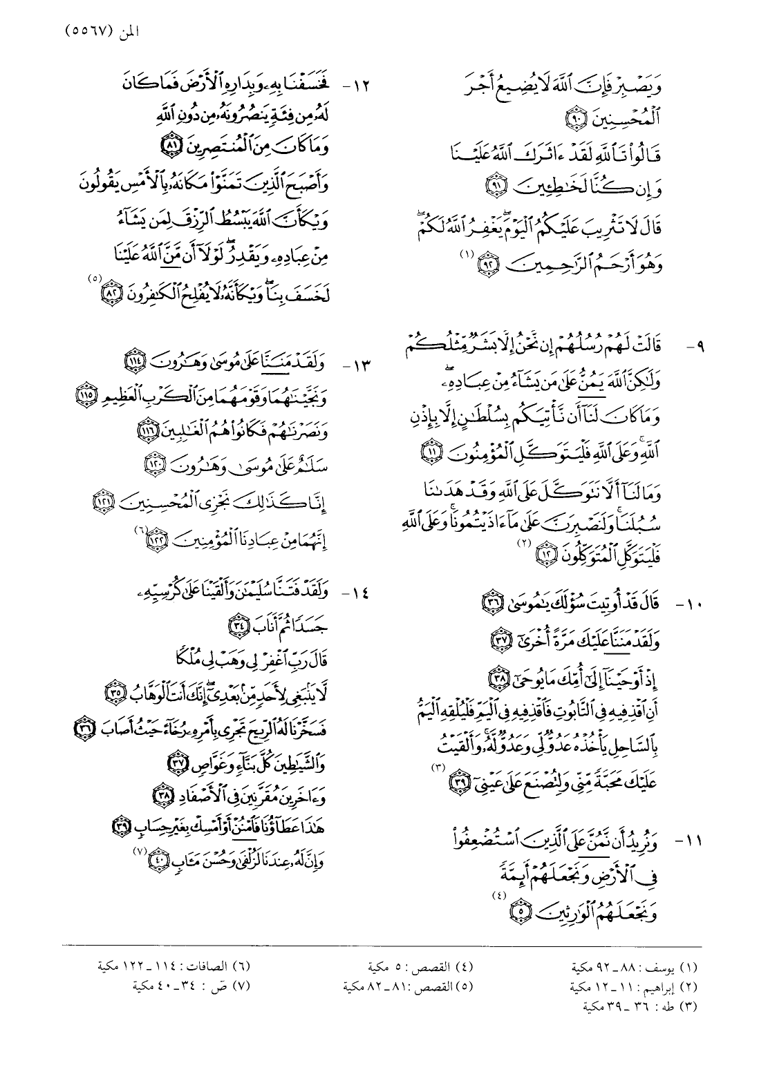 13- وَلَقَدْ مَنَنَّا عَلى مُوسى وَهارُونَ (114) وَنَجَّيْناهُما وَقَوْمَهُما مِنَ الْكَرْبِ الْعَظِيمِ (115) وَنَصَرْناهُمْ فَكانُوا هُمُ الْغالِبِينَ (116) وَآتَيْناهُمَا الْكِتابَ الْمُسْتَبِينَ (117) وَهَدَيْناهُمَا الصِّراطَ الْمُسْتَقِيمَ (118) وَتَرَكْنا عَلَيْهِما فِي الْآخِرِينَ (119) سَلامٌ عَلى مُوسى وَهارُونَ (120) إِنَّا كَذلِكَ نَجْزِي الْمُحْسِنِينَ (121) إِنَّهُما مِنْ عِبادِنَا الْمُؤْمِنِينَ (122) «6»