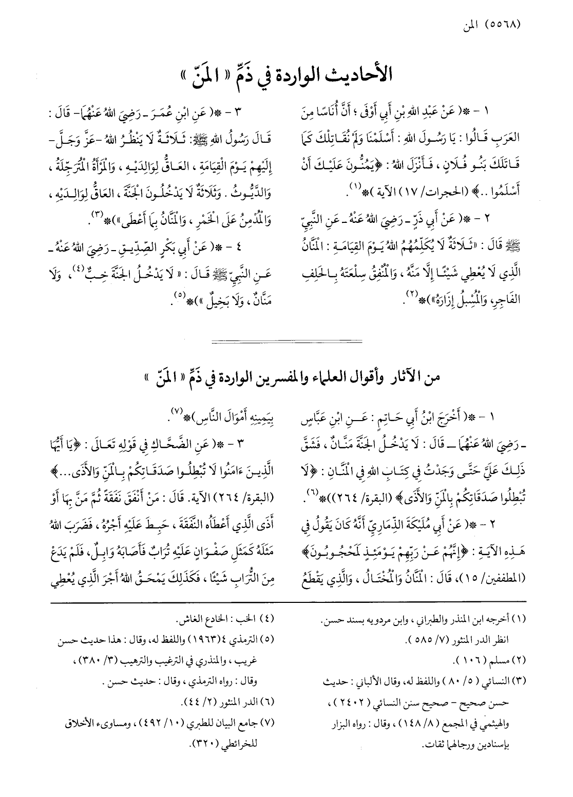 1-* (أخرج ابن أبي حاتم: عن ابن عبّاس رضي الله عنهما- قال: لا يدخل الجنّة منّان، فشقّ ذلك عليّ حتّى وجدت في كتاب الله في المنّان: لا تُبْطِلُوا صَدَقاتِكُمْ بِالْمَنِّ وَالْأَذى (البقرة/ 264)) * «6» .