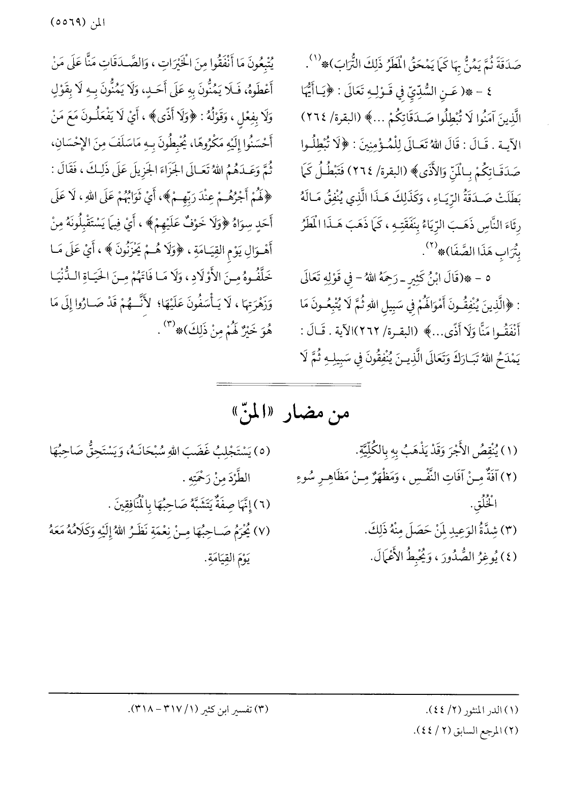 5-* (قال ابن كثير- رحمه الله- في قوله تعالى: الَّذِينَ يُنْفِقُونَ أَمْوالَهُمْ فِي سَبِيلِ اللَّهِ ثُمَّ لا يُتْبِعُونَ ما أَنْفَقُوا مَنًّا وَلا أَذىً ... (البقرة/ 262) الآية. قال: يمدح الله تبارك وتعالى الّذين ينفقون في سبيله ثمّ لا يتبعون ما أنفقوا من الخيرات، والصّدقات منّا على من أعطوه، فلا يمنّون به على أحد، ولا يمنّون به لا بقول ولا بفعل، وقوله: وَلا أَذىً، أي لا يفعلون مع من أحسنوا إليه مكروها، يحبطون به ما سلف من الإحسان، ثمّ وعدهم الله تعالى الجزاء الجزيل على ذلك، فقال: لَهُمْ أَجْرُهُمْ عِنْدَ رَبِّهِمْ، أي ثوابهم على الله، لا على أحد سواه وَلا خَوْفٌ عَلَيْهِمْ، أي فيما يستقبلونه من أهوال يوم القيامة، وَلا هُمْ يَحْزَنُونَ، أي على ما خلّفوه من الأولاد، ولا ما فاتهم من الحياة الدّنيا وزهرتها، لا يأسفون عليها؛ لأنّهم قد صاروا إلى ما هو خير لهم من ذلك) * «3» .
