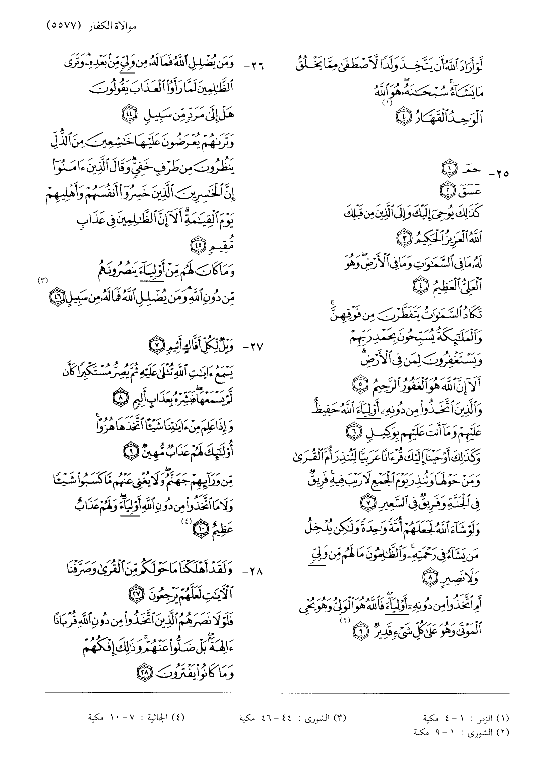 25- حم (1) عسق (2) كَذلِكَ يُوحِي إِلَيْكَ وَإِلَى الَّذِينَ مِنْ قَبْلِكَ اللَّهُ الْعَزِيزُ الْحَكِيمُ (3) لَهُ ما فِي السَّماواتِ وَما فِي الْأَرْضِ وَهُوَ الْعَلِيُّ الْعَظِيمُ (4) تَكادُ السَّماواتُ يَتَفَطَّرْنَ مِنْ فَوْقِهِنَّ وَالْمَلائِكَةُ يُسَبِّحُونَ بِحَمْدِ رَبِّهِمْ وَيَسْتَغْفِرُونَ لِمَنْ فِي الْأَرْضِ أَلا إِنَّ اللَّهَ هُوَ الْغَفُورُ الرَّحِيمُ (5) وَالَّذِينَ اتَّخَذُوا مِنْ دُونِهِ أَوْلِياءَ اللَّهُ حَفِيظٌ عَلَيْهِمْ وَما أَنْتَ عَلَيْهِمْ بِوَكِيلٍ (6) وَكَذلِكَ أَوْحَيْنا إِلَيْكَ قُرْآناً عَرَبِيًّا لِتُنْذِرَ أُمَّ الْقُرى وَمَنْ حَوْلَها وَتُنْذِرَ يَوْمَ الْجَمْعِ لا رَيْبَ فِيهِ فَرِيقٌ فِي الْجَنَّةِ وَفَرِيقٌ فِي السَّعِيرِ (7) وَلَوْ شاءَ اللَّهُ لَجَعَلَهُمْ أُمَّةً واحِدَةً وَلكِنْ يُدْخِلُ مَنْ يَشاءُ فِي رَحْمَتِهِ وَالظَّالِمُونَ ما لَهُمْ مِنْ وَلِيٍّ وَلا نَصِيرٍ (8) أَمِ اتَّخَذُوا مِنْ دُونِهِ أَوْلِياءَ فَاللَّهُ هُوَ الْوَلِيُّ وَهُوَ يُحْيِ الْمَوْتى وَهُوَ عَلى كُلِّ شَيْءٍ قَدِيرٌ (9) «2»