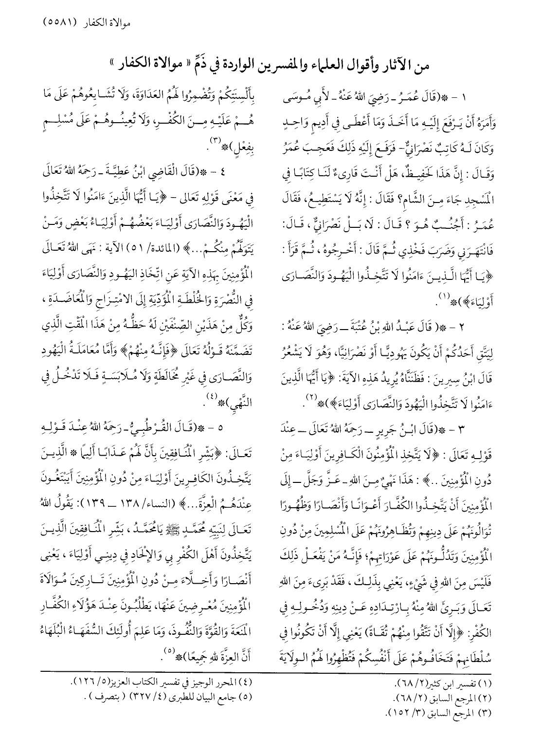 من الآثار وأقوال العلماء والمفسرين الواردة في ذمّ (موالاة الكفار)