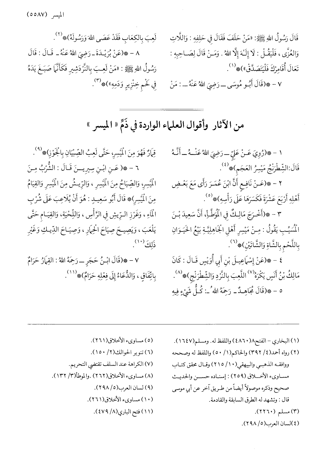 من الآثار وأقوال العلماء الواردة في ذمّ (الميسر)