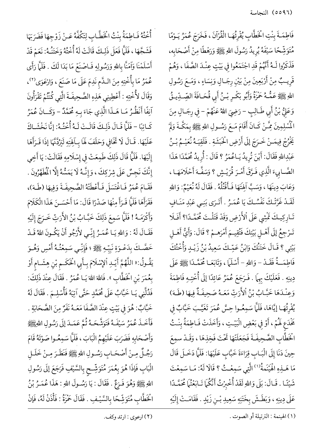 أفلا ترجع إلى أهل بيتك فتقيم أمرهم؟ قال: وأيّ أهل بيتي؟ قال ختنك وابن عمّك سعيد بن زيد وأختك فاطمة فقد- والله- أسلما، وتابعا محمّدا صلى الله عليه وسلّم على دينه. فعليك بهما. فرجع عمر عائدا إلى أخته فاطمة وعندها خبّاب بن الأرتّ معه صحيفة فيها (طه) يقرئها إيّاها، فلمّا سمعوا حسّ عمر تغيّب خبّاب في مخدع لهم، أو في بعض البيت، وأخذت فاطمة بنت الخطّاب الصّحيفة فجعلتها تحت فخذها، وقد سمع حين دنا إلى الباب قراءة خبّاب عليها: فلمّا دخل قال ما هذه الهينمة «1» الّتي سمعت؟ قالا له: