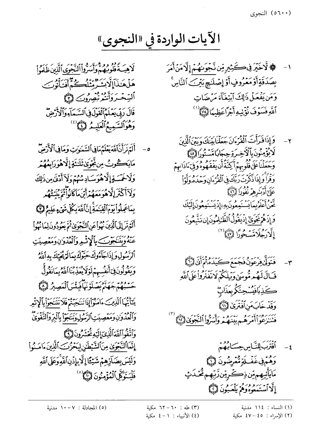 1-* لا خَيْرَ فِي كَثِيرٍ مِنْ نَجْواهُمْ إِلَّا مَنْ أَمَرَ بِصَدَقَةٍ أَوْ مَعْرُوفٍ أَوْ إِصْلاحٍ بَيْنَ النَّاسِ وَمَنْ يَفْعَلْ ذلِكَ ابْتِغاءَ مَرْضاتِ اللَّهِ فَسَوْفَ نُؤْتِيهِ أَجْراً عَظِيماً (114) »
