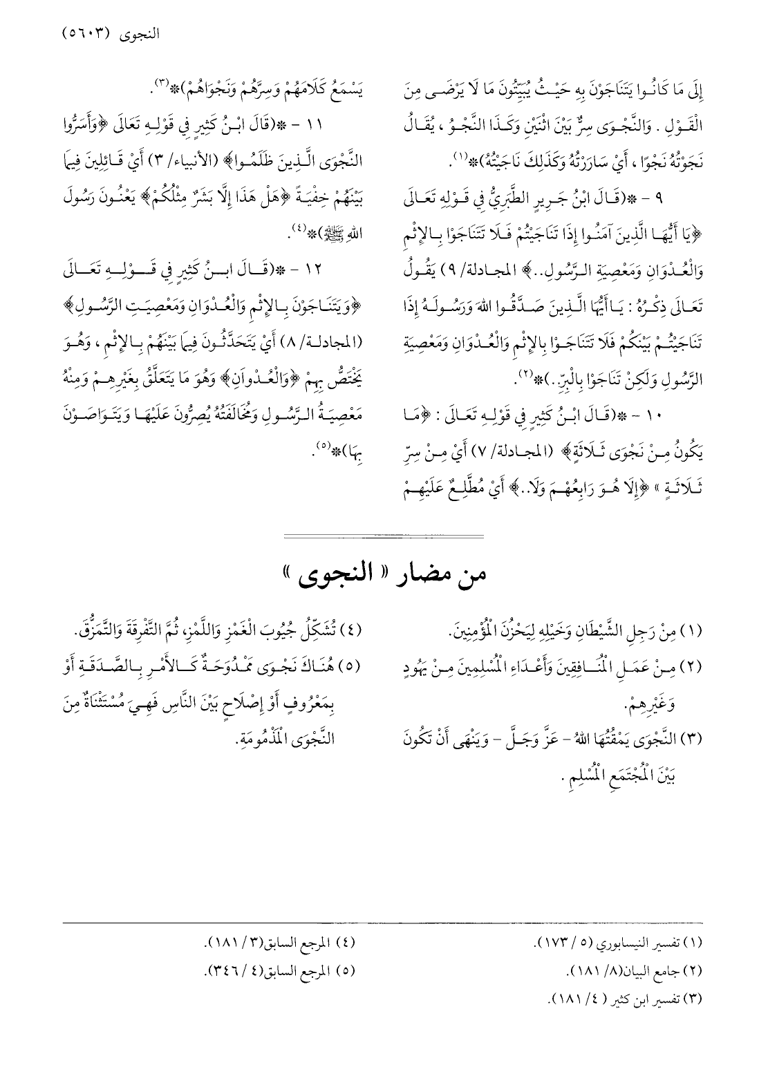 12-* (قال ابن كثير في قوله تعالى وَيَتَناجَوْنَ بِالْإِثْمِ وَالْعُدْوانِ وَمَعْصِيَةِ الرَّسُولِ (المجادلة/ 8) أي يتحدّثون فيما بينهم بالإثم، وهو يختصّ بهم وَالْعُدْوانِ وهو ما يتعلّق بغيرهم ومنه معصية الرّسول ومخالفته يصرّون عليها ويتواصون بها) * «5» .