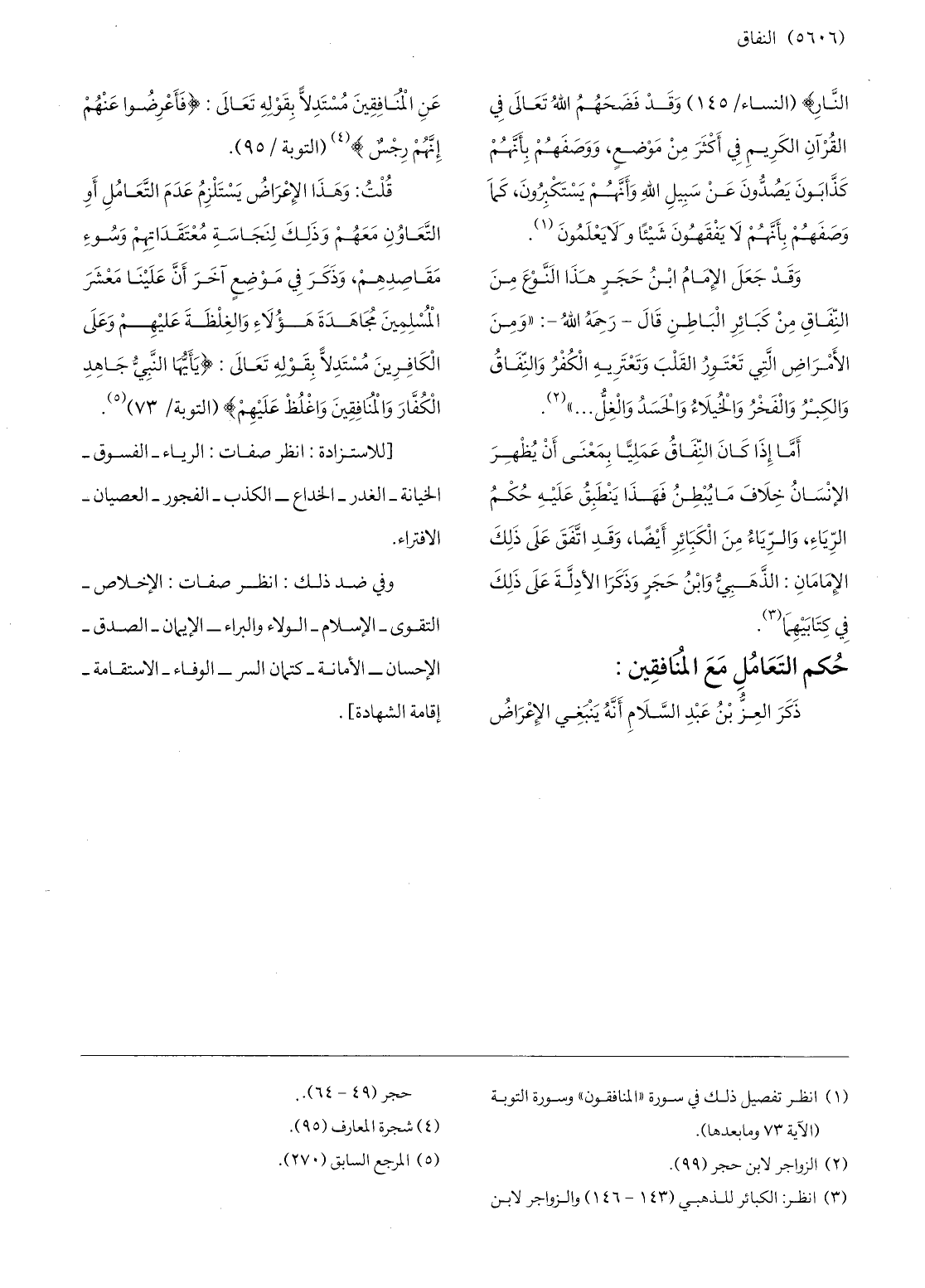 ذكر العزّ بن عبد السّلام أنّه ينبغي الإعراض عن المنافقين مستدلّا بقوله تعالى: فَأَعْرِضُوا عَنْهُمْ إِنَّهُمْ رِجْسٌ «6» (التوبة/ 95) .