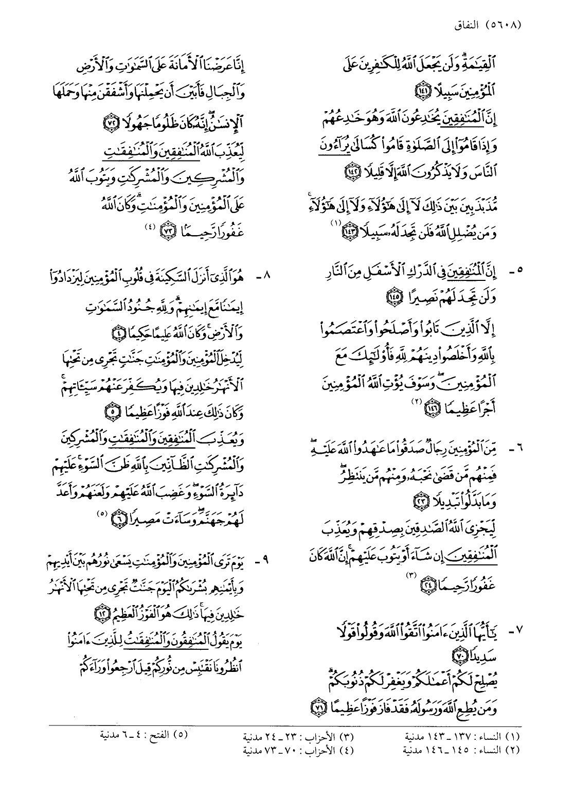 5- إِنَّ الْمُنافِقِينَ فِي الدَّرْكِ الْأَسْفَلِ مِنَ النَّارِ وَلَنْ تَجِدَ لَهُمْ نَصِيراً (145) إِلَّا الَّذِينَ تابُوا وَأَصْلَحُوا وَاعْتَصَمُوا بِاللَّهِ وَأَخْلَصُوا دِينَهُمْ لِلَّهِ فَأُولئِكَ مَعَ الْمُؤْمِنِينَ وَسَوْفَ يُؤْتِ اللَّهُ الْمُؤْمِنِينَ أَجْراً عَظِيماً (146) «2»