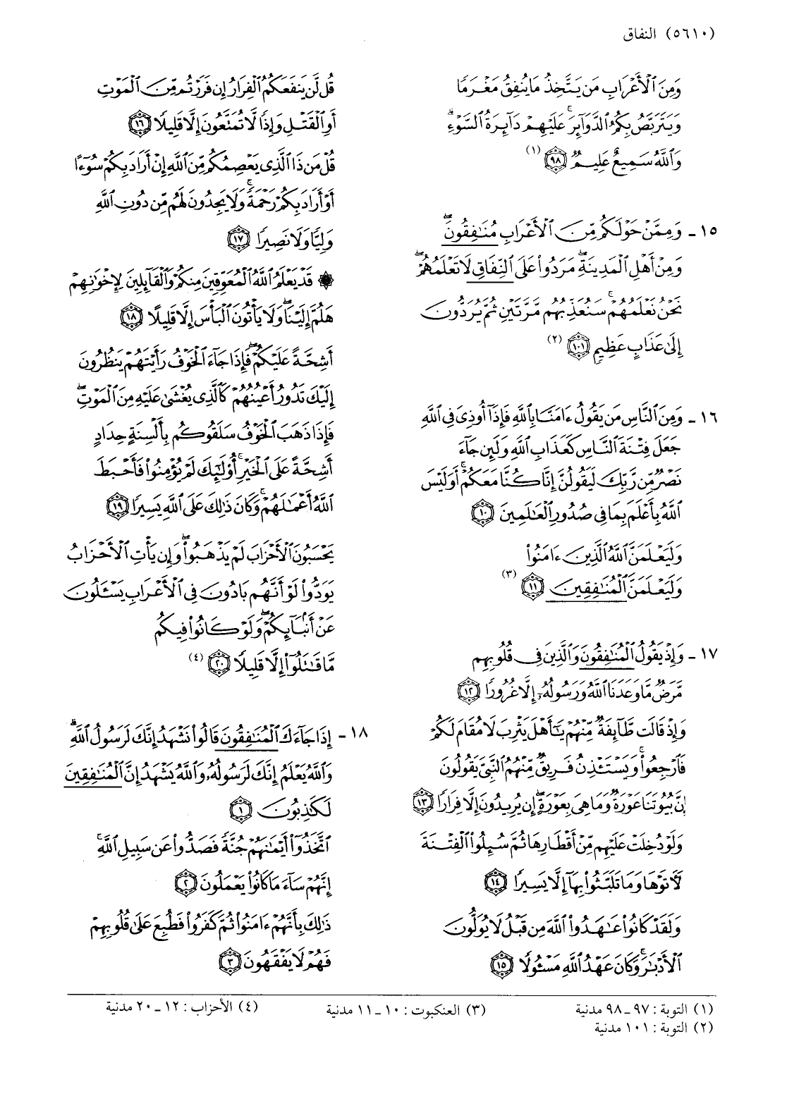 17- وَإِذْ يَقُولُ الْمُنافِقُونَ وَالَّذِينَ فِي قُلُوبِهِمْ مَرَضٌ ما وَعَدَنَا اللَّهُ وَرَسُولُهُ إِلَّا غُرُوراً (12) وَإِذْ قالَتْ طائِفَةٌ مِنْهُمْ يا أَهْلَ يَثْرِبَ لا مُقامَ لَكُمْ فَارْجِعُوا وَيَسْتَأْذِنُ فَرِيقٌ مِنْهُمُ النَّبِيَّ يَقُولُونَ إِنَّ بُيُوتَنا عَوْرَةٌ وَما هِيَ بِعَوْرَةٍ إِنْ يُرِيدُونَ إِلَّا فِراراً (13) وَلَوْ دُخِلَتْ عَلَيْهِمْ مِنْ أَقْطارِها ثُمَّ سُئِلُوا الْفِتْنَةَ لَآتَوْها وَما تَلَبَّثُوا بِها إِلَّا يَسِيراً (14) وَلَقَدْ كانُوا عاهَدُوا اللَّهَ مِنْ قَبْلُ لا يُوَلُّونَ الْأَدْبارَ وَكانَ عَهْدُ اللَّهِ مَسْؤُلًا (15) قُلْ لَنْ يَنْفَعَكُمُ الْفِرارُ إِنْ فَرَرْتُمْ مِنَ الْمَوْتِ أَوِ الْقَتْلِ وَإِذاً لا تُمَتَّعُونَ إِلَّا قَلِيلًا (16) قُلْ مَنْ ذَا الَّذِي يَعْصِمُكُمْ مِنَ اللَّهِ إِنْ أَرادَ بِكُمْ سُوءاً أَوْ أَرادَ بِكُمْ رَحْمَةً وَلا يَجِدُونَ لَهُمْ مِنْ دُونِ اللَّهِ وَلِيًّا وَلا نَصِيراً (17) * قَدْ يَعْلَمُ اللَّهُ الْمُعَوِّقِينَ مِنْكُمْ وَالْقائِلِينَ لِإِخْوانِهِمْ هَلُمَّ إِلَيْنا وَلا يَأْتُونَ الْبَأْسَ إِلَّا قَلِيلًا (18) أَشِحَّةً عَلَيْكُمْ فَإِذا جاءَ الْخَوْفُ رَأَيْتَهُمْ يَنْظُرُونَ إِلَيْكَ تَدُورُ أَعْيُنُهُمْ كَالَّذِي يُغْشى عَلَيْهِ مِنَ الْمَوْتِ فَإِذا ذَهَبَ الْخَوْفُ سَلَقُوكُمْ بِأَلْسِنَةٍ حِدادٍ أَشِحَّةً عَلَى الْخَيْرِ أُولئِكَ لَمْ يُؤْمِنُوا فَأَحْبَطَ اللَّهُ أَعْمالَهُمْ وَكانَ ذلِكَ عَلَى اللَّهِ يَسِيراً (19) يَحْسَبُونَ الْأَحْزابَ لَمْ يَذْهَبُوا وَإِنْ يَأْتِ الْأَحْزابُ يَوَدُّوا لَوْ أَنَّهُمْ بادُونَ فِي الْأَعْرابِ يَسْئَلُونَ عَنْ أَنْبائِكُمْ وَلَوْ كانُوا فِيكُمْ ما قاتَلُوا إِلَّا قَلِيلًا