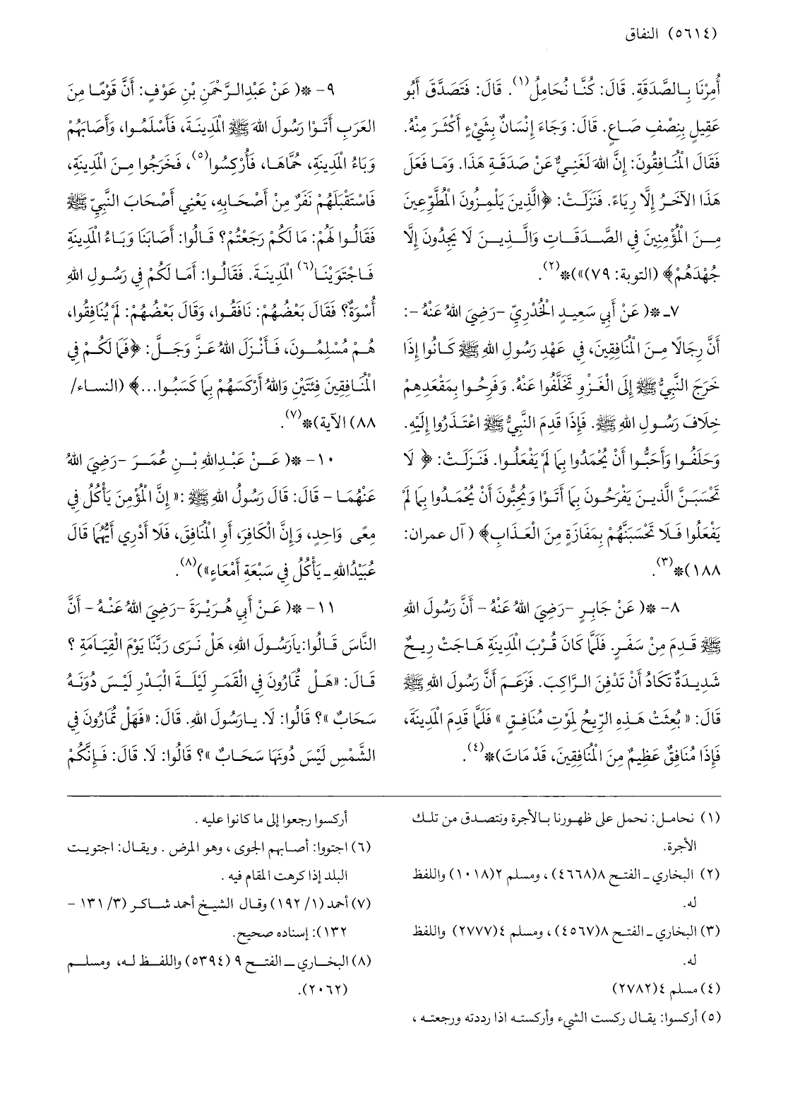 7-* (عن أبي سعيد الخدريّ- رضي الله عنه-: أنّ رجالا من المنافقين، في عهد رسول الله صلى الله عليه وسلّم كانوا إذا خرج النّبيّ صلى الله عليه وسلّم إلى الغزو تخلّفوا عنه. وفرحوا بمقعدهم خلاف رسول الله صلى الله عليه وسلّم. فإذا قدم النّبيّ صلى الله عليه وسلّم اعتذروا إليه. وحلفوا وأحبّوا أن يحمدوا بما لم يفعلوا.