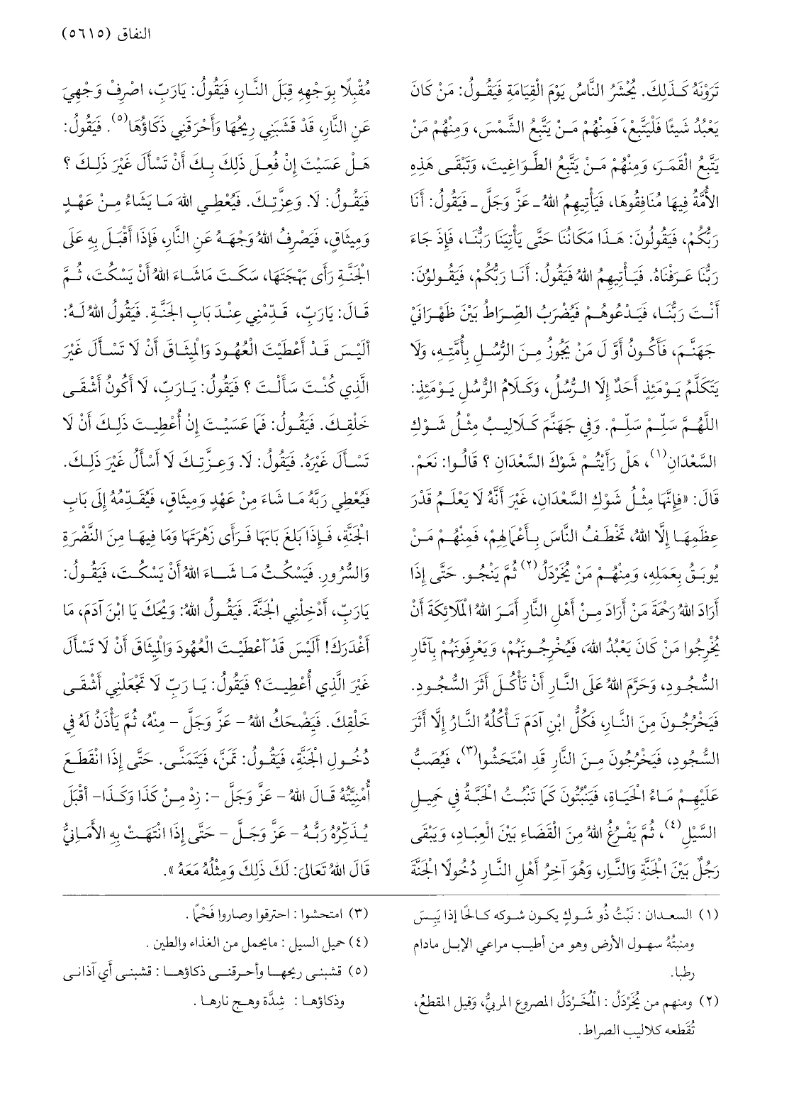 قالوا: نعم. قال: «فإنّها مثل شوك السّعدان، غير أنّه لا يعلم قدر عظمها إلّا الله، تخطف النّاس بأعمالهم، فمنهم من يوبق بعمله، ومنهم من يخردل «2» ثمّ ينجو. حتّى إذا أراد الله رحمة من أراد من أهل النّار أمر الله الملائكة أن يخرجوا من كان يعبد الله، فيخرجونهم، ويعرفونهم بآثار السّجود، وحرّم الله على النّار أن تأكل أثر السّجود. فيخرجون من النّار، فكلّ ابن آدم تأكله النّار إلّا أثر السّجود، فيخرجون من النّار قد امتحشوا «3» ، فيصبّ عليهم ماء الحياة، فينبتون كما تنبت الحبّة في حميل السّيل «4» ، ثمّ يفرغ الله من القضاء بين العباد، ويبقى رجل بين الجنّة والنّار، وهو آخر أهل النّار دخولا الجنّة مقبلا بوجهه قبل النّار، فيقول: يا ربّ، اصرف وجهي عن النّار، قد قشبني ريحها وأحرقني ذكاؤها «5» . فيقول: هل عسيت إن فعل ذلك بك أن تسأل غير ذلك؟ فيقول: لا.