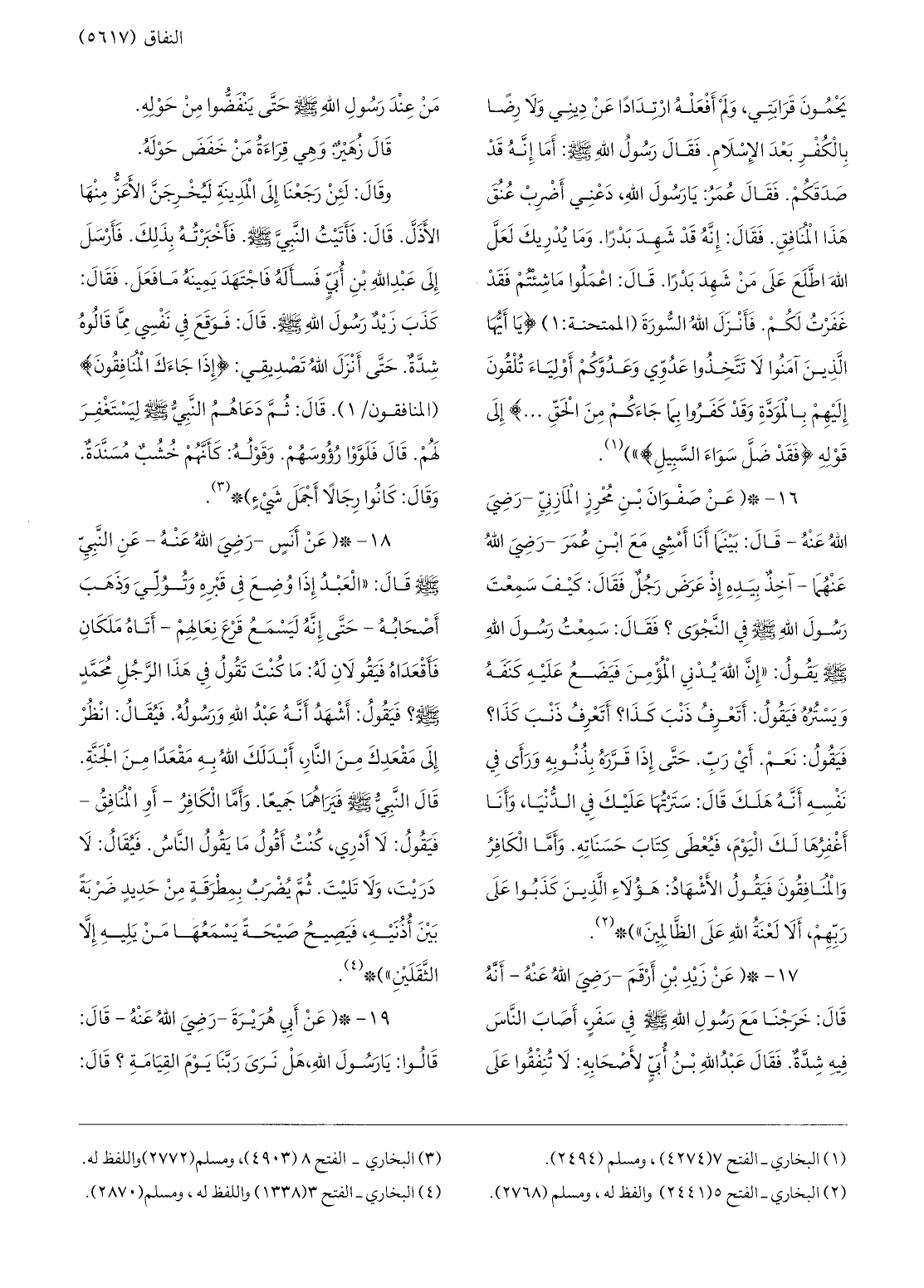 17-* (عن زيد بن أرقم- رضي الله عنه- أنّه قال: خرجنا مع رسول الله صلى الله عليه وسلّم في سفر، أصاب النّاس فيه شدّة. فقال عبد الله بن أبيّ لأصحابه: لا تنفقوا على من عند رسول الله صلى الله عليه وسلّم حتّى ينفضّوا من حوله.