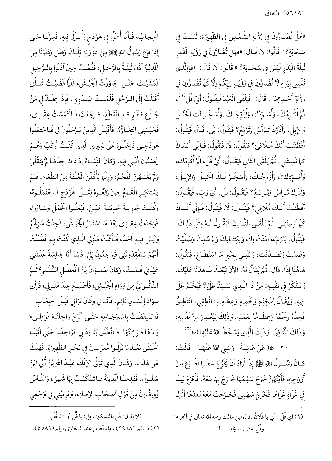 كان رسول الله صلى الله عليه وسلّم إذا أراد أن يخرج سفرا أقرع بين أزواجه، فأيّتهنّ خرج سهمها خرج بها معه. فأقرع بيننا في غزاة غزاها فخرج سهمي فخرجت معه بعد ما أنزل الحجاب، فأنا أحمل في هودج وأنزل فيه. فسرنا حتّى إذا فرغ رسول الله صلى الله عليه وسلّم من غزوته تلك وقفل ودنونا من المدينة آذن ليلة بالرّحيل، فقمت حين آذنوا بالرّحيل فمشيت حتّى جاوزت الجيش، فلمّا قضيت شأني أقبلت إلى الرّحل فلمست صدري، فإذا عقد لي من جزع ظفار قد انقطع، فرجعت فالتمست عقدي، فحبسني ابتغاؤه. فأقبل الّذين يرحلون لي فاحتملوا هودجي فرحلوه على بعيري الّذي كنت أركب وهم يحسبون أنّي فيه، وكان النّساء إذ ذاك خفافا لم يثقلن ولم يغشهنّ اللّحم، وإنّما يأكلن العلقة من الطّعام. فلم يستنكر القوم حين رفعوه ثقل الهودج فاحتملوه، وكنت جارية حديثة السّنّ، فبعثوا الجمل وساروا، فوجدت عقدي بعد ما استمرّ الجيش، فجئت منزلهم وليس فيه أحد، فأممت منزلي الّذي كنت به فظننت أنّهم سيفقدونني فيرجعون إليّ. فبينا أنا جالسة غلبتني عيناي فنمت، وكان صفوان بن المعطّل السّلميّ ثمّ الذّكوانيّ من وراء الجيش، فأصبح عند منزلي، فرأي سواد إنسان نائم، فأتاني وكان يراني قبل الحجاب- فاستيقظت باسترجاعه حتّى أناخ راحلته فوطىء يدها فركبتها. فانطلق يقود بي الرّاحلة حتّى أتينا الجيش بعد ما نزلوا معرّسين في نحر الظّهيرة. فهلك من هلك.
