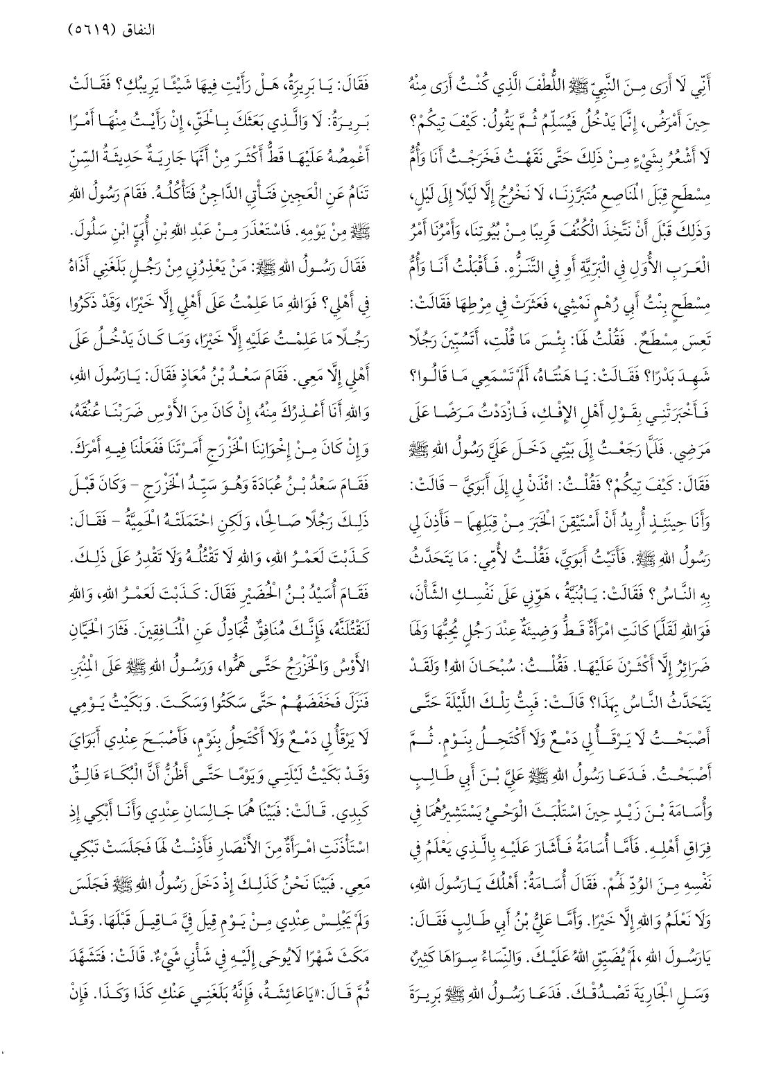 فاستعذر من عبد الله بن أبيّ ابن سلول. فقال رسول الله صلى الله عليه وسلّم: من يعذرني من رجل بلغني أذاه في أهلي؟ فو الله ما علمت على أهلي إلّا خيرا، وقد ذكروا رجلا ما علمت عليه إلّا خيرا، وما كان يدخل على أهلي إلّا معي. فقام سعد بن معاذ فقال: يا رسول الله، والله أنا أعذرك منه، إن كان من الأوس ضربنا عنقه، وإن كان من إخواننا الخزرج أمرتنا ففعلنا فيه أمرك. فقام سعد بن عبادة وهو سيّد الخزرج- وكان قبل ذلك رجلا صالحا، ولكن احتملته الحميّة- فقال: كذبت لعمر الله، والله لا تقتله ولا تقدر على ذلك. فقام أسيد بن الحضير فقال: كذبت لعمر الله، والله لنقتلنّه، فإنّك منافق تجادل عن المنافقين. فثار الحيّان الأوس والخزرج حتّى همّوا، ورسول الله صلى الله عليه وسلّم على المنبر. فنزل فخفضهم حتّى سكتوا وسكت. وبكيت يومي لا يرقأ لي دمع ولا أكتحل بنوم، فأصبح عندي أبواي وقد بكيت ليلتي ويوما حتّى أظنّ أنّ البكاء فالق كبدي. قالت: فبينا هما جالسان عندي وأنا أبكي إذ استأذنت امرأة من الأنصار فأذنت لها فجلست تبكي معي. فبينا نحن كذلك إذ دخل رسول الله صلى الله عليه وسلّم فجلس ولم يجلس عندي من يوم قيل فيّ ما قيل قبلها. وقد مكث شهرا لا يوحى إليه في شأني شيء.
