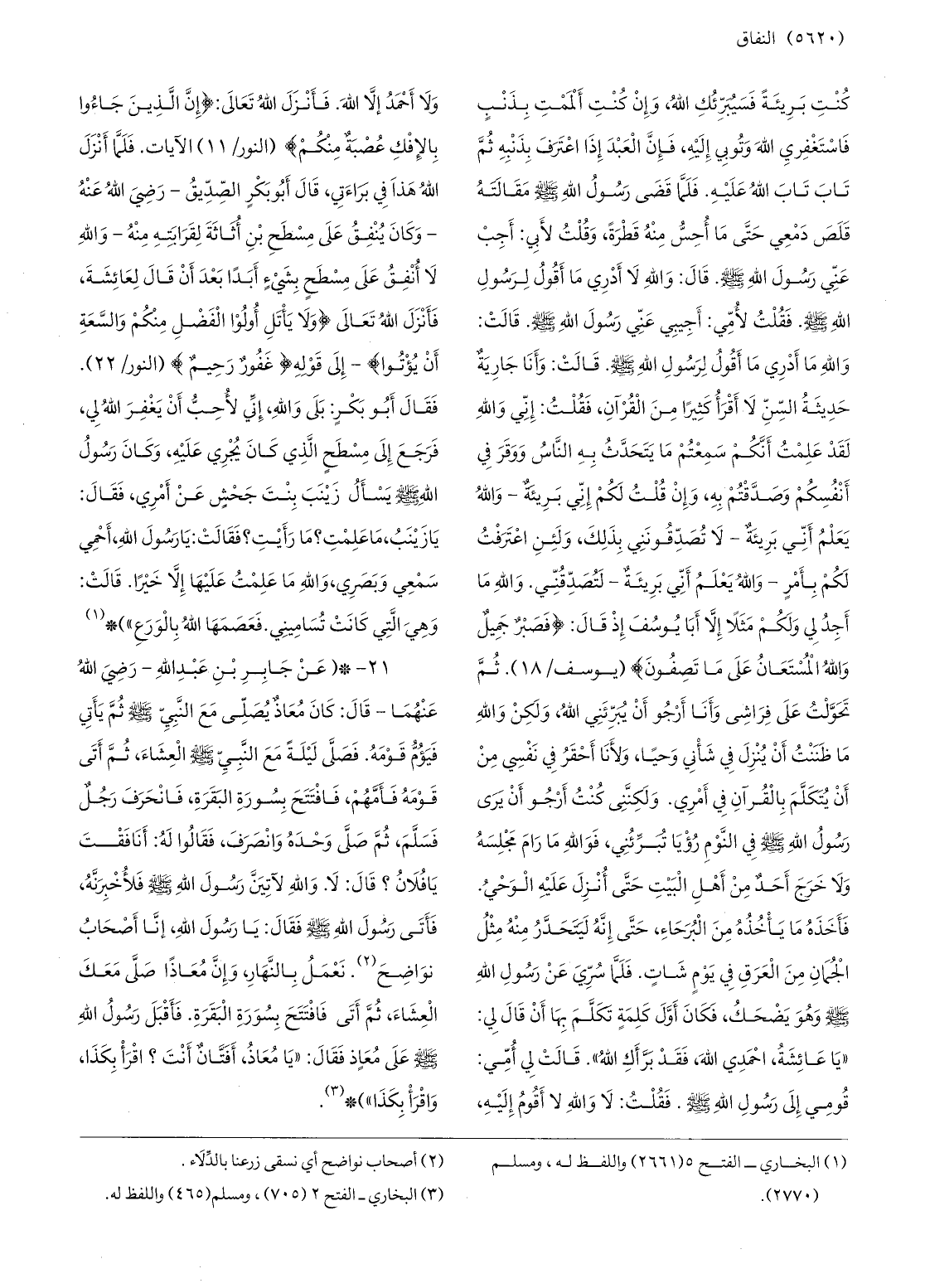 بذنب فاستغفري الله وتوبي إليه، فإنّ العبد إذا اعترف بذنبه ثمّ تاب تاب الله عليه. فلمّا قضى رسول الله صلى الله عليه وسلّم مقالته قلص دمعي حتّى ما أحسّ منه قطرة، وقلت لأبي: أجب عنّي رسول الله صلى الله عليه وسلّم. قال: والله لا أدري ما أقول لرسول الله صلى الله عليه وسلّم. فقلت لأمّي: أجيبي عنّي رسول الله صلى الله عليه وسلّم. قالت: والله ما أدري ما أقول لرسول الله صلى الله عليه وسلّم.