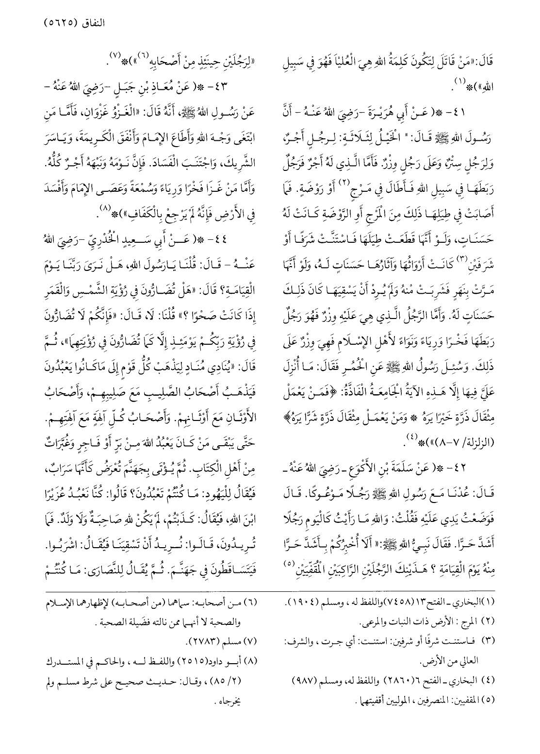 43-* (عن معاذ بن جبل- رضي الله عنه- عن رسول الله صلى الله عليه وسلّم، أنّه قال: «الغزو غزوان، فأمّا من ابتغى وجه الله وأطاع الإمام وأنفق الكريمة، وياسر الشّريك، واجتنب الفساد. فإنّ نومه ونبهه أجر كلّه.