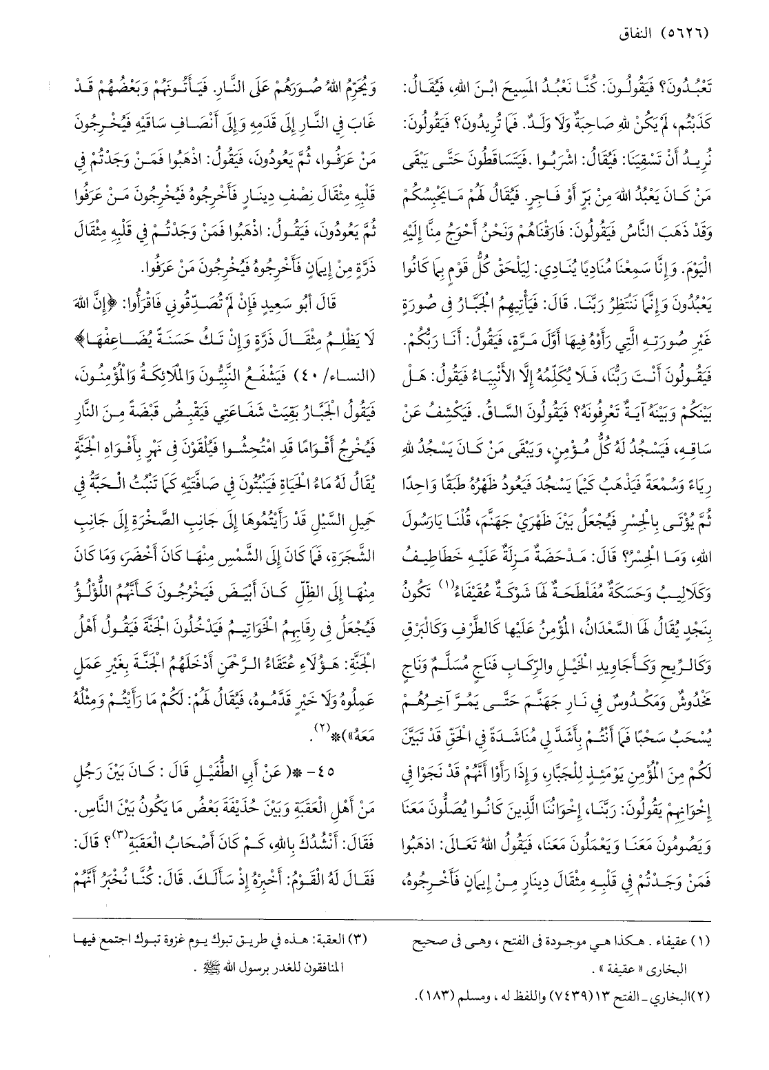 فيقولون أنت ربّنا، فلا يكلّمه إلّا الأنبياء فيقول: هل بينكم وبينه آية تعرفونه؟ فيقولون السّاق. فيكشف عن ساقه، فيسجد له كلّ مؤمن، ويبقى من كان يسجد لله رياء وسمعة فيذهب كيما يسجد فيعود ظهره طبقا واحدا ثمّ يؤتى بالجسر فيجعل بين ظهري جهنّم، قلنا يا رسول الله، وما الجسر؟ قال: مدحضة مزلة عليه خطاطيف وكلاليب وحسكة مفلطحة لها شوكة عقيفاء «1» تكون بنجد يقال لها السّعدان، المؤمن عليها كالطّرف وكالبرق وكالرّيح وكأجاويد الخيل والرّكاب فناج مسلّم وناج مخدوش ومكدوس في نار جهنّم حتّى يمرّ آخرهم يسحب سحبا فما أنتم بأشدّ لي مناشدة في الحقّ قد تبيّن لكم من المؤمن يومئذ للجبّار، وإذا رأوا أنّهم قد نجوا في إخوانهم يقولون: ربّنا، إخواننا الّذين كانوا يصلّون معنا ويصومون معنا ويعملون معنا، فيقول الله تعالى: اذهبوا فمن وجدتم في قلبه مثقال دينار من إيمان فأخرجوه، ويحرّم الله صورهم على النّار. فيأتونهم وبعضهم قد غاب في النّار إلى قدمه وإلى أنصاف ساقيه فيخرجون من عرفوا، ثمّ يعودون، فيقول: اذهبوا فمن وجدتم في قلبه مثقال نصف دينار فأخرجوه فيخرجون من عرفوا ثمّ يعودون، فيقول: اذهبوا فمن وجدتم في قلبه مثقال ذرّة من إيمان فأخرجوه فيخرجون من عرفوا.
