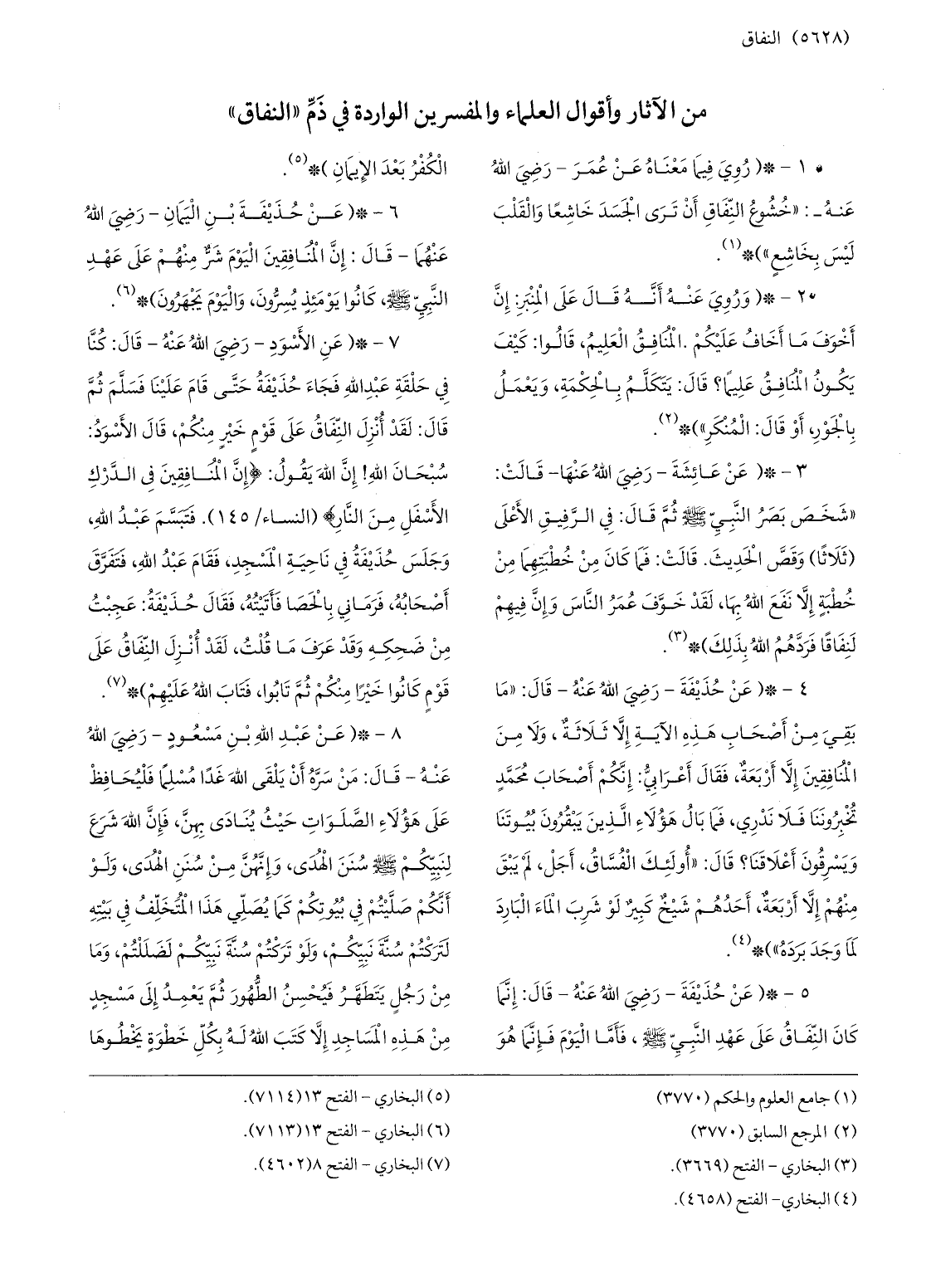 6-* (عن حذيفة بن اليمان- رضي الله عنهما- قال: إنّ المنافقين اليوم شرّ منهم على عهد النّبيّ صلى الله عليه وسلّم، كانوا يومئذ يسرّون، واليوم يجهرون) * «6» .
