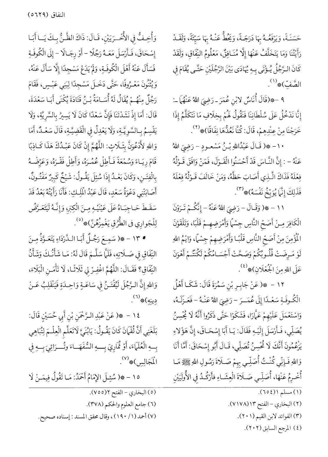 13-* (سمع رجل أبا الدّرداء يتعوّذ من النّفاق في صلاته، فلمّا سلّم قال له: ما شأنك وشأن النّفاق؟ فقال: اللهمّ اغفر لي ثلاثا، لا تأمن البلاء، والله إنّ الرّجل ليفتن في ساعة واحدة فينقلب عن دينه) * «6» .