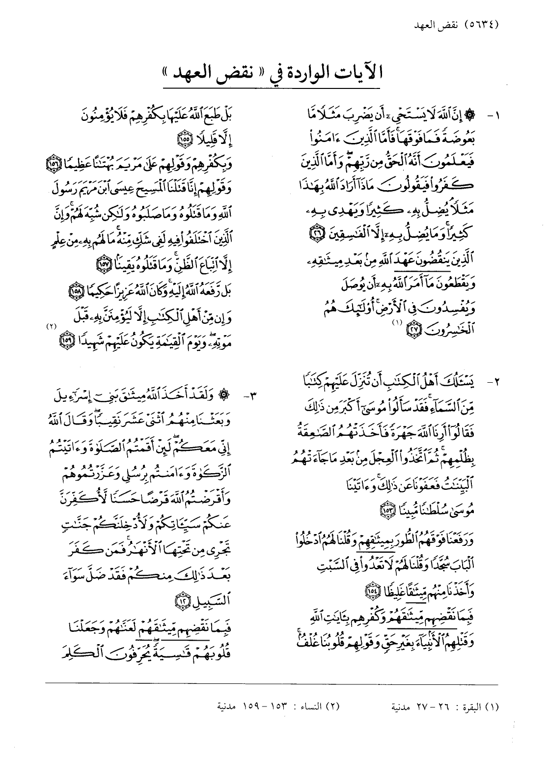 2- يَسْئَلُكَ أَهْلُ الْكِتابِ أَنْ تُنَزِّلَ عَلَيْهِمْ كِتاباً مِنَ السَّماءِ فَقَدْ سَأَلُوا مُوسى أَكْبَرَ مِنْ ذلِكَ فَقالُوا أَرِنَا اللَّهَ جَهْرَةً فَأَخَذَتْهُمُ الصَّاعِقَةُ بِظُلْمِهِمْ ثُمَّ اتَّخَذُوا الْعِجْلَ مِنْ بَعْدِ ما جاءَتْهُمُ الْبَيِّناتُ فَعَفَوْنا عَنْ ذلِكَ وَآتَيْنا مُوسى سُلْطاناً مُبِيناً (153) وَرَفَعْنا فَوْقَهُمُ الطُّورَ بِمِيثاقِهِمْ وَقُلْنا لَهُمُ ادْخُلُوا الْبابَ سُجَّداً وَقُلْنا لَهُمْ لا تَعْدُوا فِي السَّبْتِ وَأَخَذْنا مِنْهُمْ مِيثاقاً غَلِيظاً (154) فَبِما نَقْضِهِمْ مِيثاقَهُمْ وَكُفْرِهِمْ بِآياتِ اللَّهِ وَقَتْلِهِمُ الْأَنْبِياءَ بِغَيْرِ حَقٍّ وَقَوْلِهِمْ قُلُوبُنا غُلْفٌ بَلْ طَبَعَ اللَّهُ عَلَيْها بِكُفْرِهِمْ فَلا يُؤْمِنُونَ إِلَّا قَلِيلًا (155) وَبِكُفْرِهِمْ وَقَوْلِهِمْ عَلى مَرْيَمَ بُهْتاناً عَظِيماً (156) وَقَوْلِهِمْ إِنَّا قَتَلْنَا الْمَسِيحَ عِيسَى ابْنَ مَرْيَمَ رَسُولَ اللَّهِ وَما قَتَلُوهُ وَما صَلَبُوهُ وَلكِنْ شُبِّهَ لَهُمْ وَإِنَّ الَّذِينَ اخْتَلَفُوا فِيهِ لَفِي شَكٍّ مِنْهُ ما لَهُمْ بِهِ مِنْ عِلْمٍ إِلَّا اتِّباعَ الظَّنِّ وَما قَتَلُوهُ يَقِيناً (157) بَلْ رَفَعَهُ اللَّهُ إِلَيْهِ وَكانَ اللَّهُ عَزِيزاً حَكِيماً (158) وَإِنْ مِنْ أَهْلِ الْكِتابِ إِلَّا لَيُؤْمِنَنَّ بِهِ قَبْلَ مَوْتِهِ وَيَوْمَ الْقِيامَةِ يَكُونُ عَلَيْهِمْ شَهِيداً (159) «2»