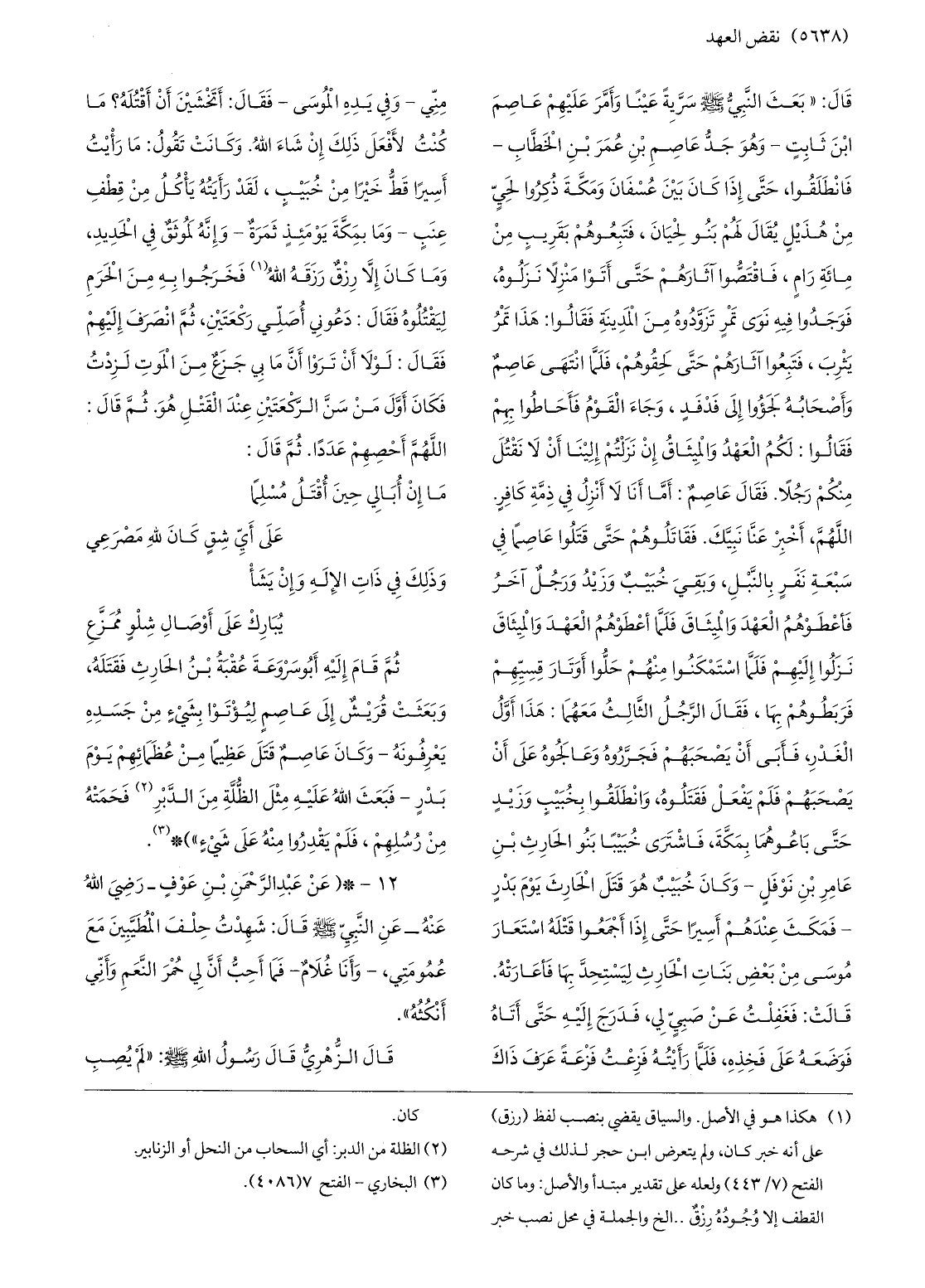 قال: «بعث النّبيّ صلى الله عليه وسلّم سريّة عينا وأمّر عليهم عاصم ابن ثابت- وهو جدّ عاصم بن عمر بن الخطّاب- فانطلقوا، حتّى إذا كان بين عسفان ومكّة ذكروا لحيّ من هذيل يقال لهم بنو لحيان، فتبعوهم بقريب من مائة رام، فاقتصّوا آثارهم حتّى أتوا منزلا نزلوه، فوجدوا فيه نوى تمر تزوّدوه من المدينة فقالوا: هذا تمر يثرب، فتبعوا آثارهم حتّى لحقوهم، فلمّا انتهى عاصم وأصحابه لجؤوا إلى فدفد، وجاء القوم فأحاطوا بهم فقالوا: لكم العهد والميثاق إن نزلتم إلينا أن لا نقتل منكم رجلا. فقال عاصم: أمّا أنا لا أنزل في ذمّة كافر.