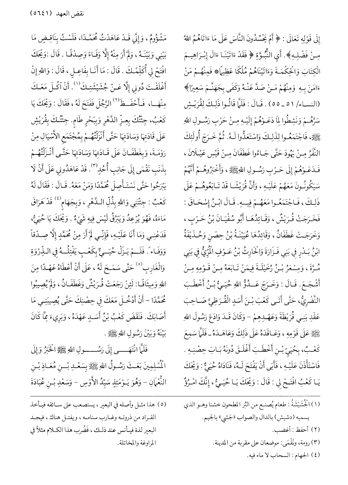 تعالى: أَمْ يَحْسُدُونَ النَّاسَ عَلى ما آتاهُمُ اللَّهُ مِنْ فَضْلِهِ. أي النّبوّة فَقَدْ آتَيْنا آلَ إِبْراهِيمَ الْكِتابَ وَالْحِكْمَةَ وَآتَيْناهُمْ مُلْكاً عَظِيماً* فَمِنْهُمْ مَنْ آمَنَ بِهِ وَمِنْهُمْ مَنْ صَدَّ عَنْهُ وَكَفى بِجَهَنَّمَ سَعِيراً (النساء/ 51- 55) . قال: فلمّا قالوا ذلك لقريش سرّهم ونشطوا لما دعوهم إليه من حرب رسول الله صلى الله عليه وسلّم، فاجتمعوا لذلك واستعدّوا له. ثمّ خرج أولئك النّفر من يهود حتّى جاءوا غطفان من قيس عيلان، فدعوهم إلى حرب رسول الله صلى الله عليه وسلّم، وأخبروهم أنّهم سيكونون معهم عليه، وأنّ قريشا قد تابعوهم على ذلك، فاجتمعوا معهم فيه. قال ابن إسحاق: