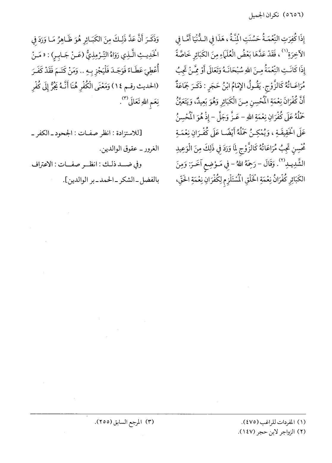 إذا كفرت النّعمة حسنت المنّة، هذا في الدّنيا أمّا في الآخرة «1» ، فقد عدّها بعض العلماء من الكبائر خاصّة إذا كانت النّعمة من الله سبحانه وتعالى أو ممّن تجب مراعاته كالزّوج. يقول الإمام ابن حجر: ذكر جماعة أنّ كفران نعمة المحسن من الكبائر وهو بعيد، ويتعيّن حمله على كفران نعمة الله- عزّ وجلّ- إذ هو المحسن على الحقيقة، ويمكن حمله أيضا على كفران نعمة محسن تجب مراعاته كالزّوج لما ورد في ذلك من الوعيد الشّديد «2» . وقال- رحمه الله- في موضع آخر: ومن الكبائر كفران نعمة الخلق المستلزم لكفران نعمة الحقّ، وذكر أنّ عدّ ذلك من الكبائر هو ظاهر ما ورد في الحديث الّذي رواه التّرمذي (عن جابر) : «من أعطي عطاء فوجد فليجز به.. ومن كتم فقد كفر (الحديث رقم 14) ومعنى الكفر هنا أنّه يجرّ إلى كفر نعم الله تعالى «3» .