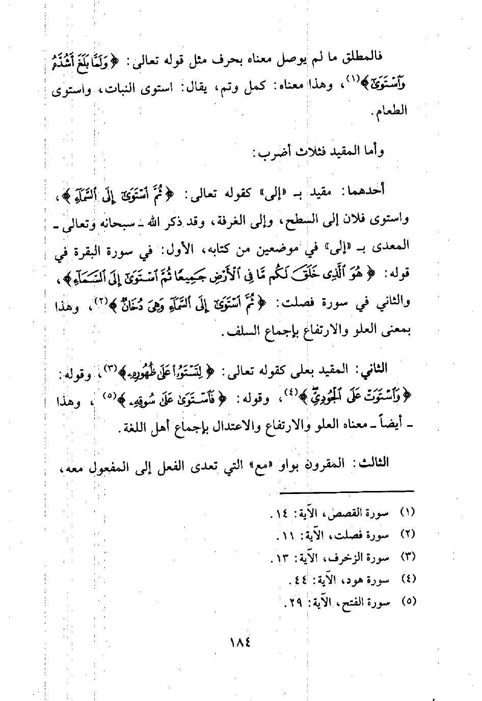 الثاني: المقيد بـ"على" كقوله تعالى: {لِتَسْتَوُوا عَلَى ظُهُورِهِ} 3، وقوله: {وَاسْتَوَتْ عَلَى الْجُودِيّ} 4، وقوله: {فَاسْتَوَى عَلَى سُوقِهِ} 5، وهذا - أيضا- معناه العلو والارتفاع والاعتدال بإجماع أهل اللغة.