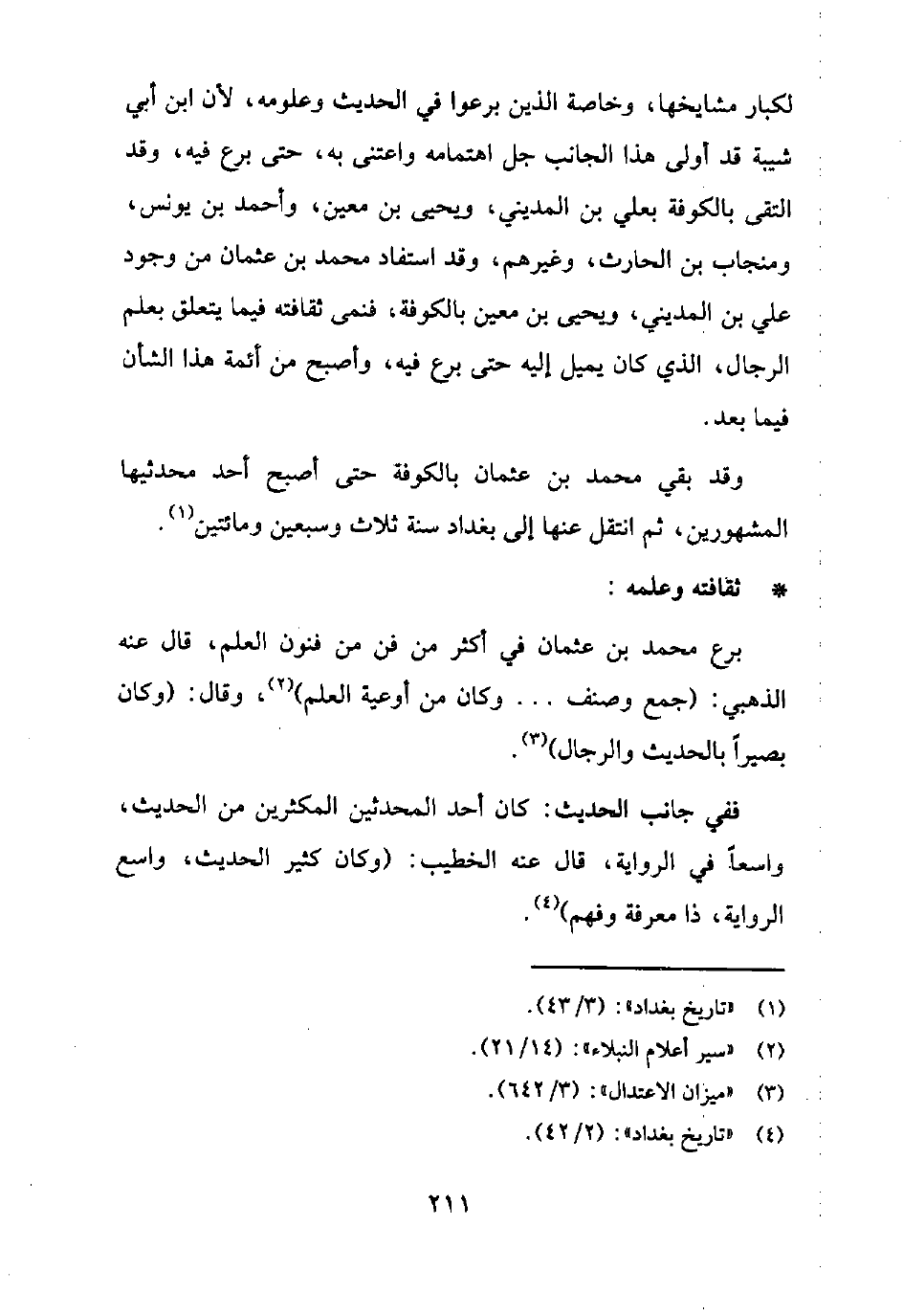 وقد بقي محمد بن عثمان بالكوفة حتى أصبح أحد محدثيها المشهورين، ثم انتقل عنها إلى بغداد سنة ثلاث وسبعين ومائتين1.