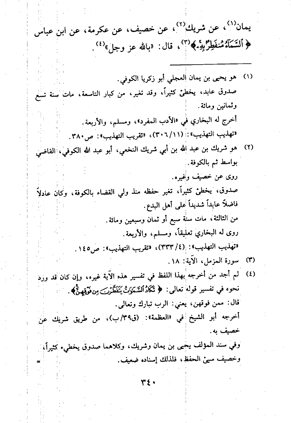 4 لم أجد من أخرجه بهذا اللفظ في تفسير هذه الآية غيره، وإن كان قد ورد نحوه في تفسير قوله تعالى: {تَكَادُ السَّمَاوَاتُ يَتَفَطَّرْنَ مِنْ فَوْقِهِن} .