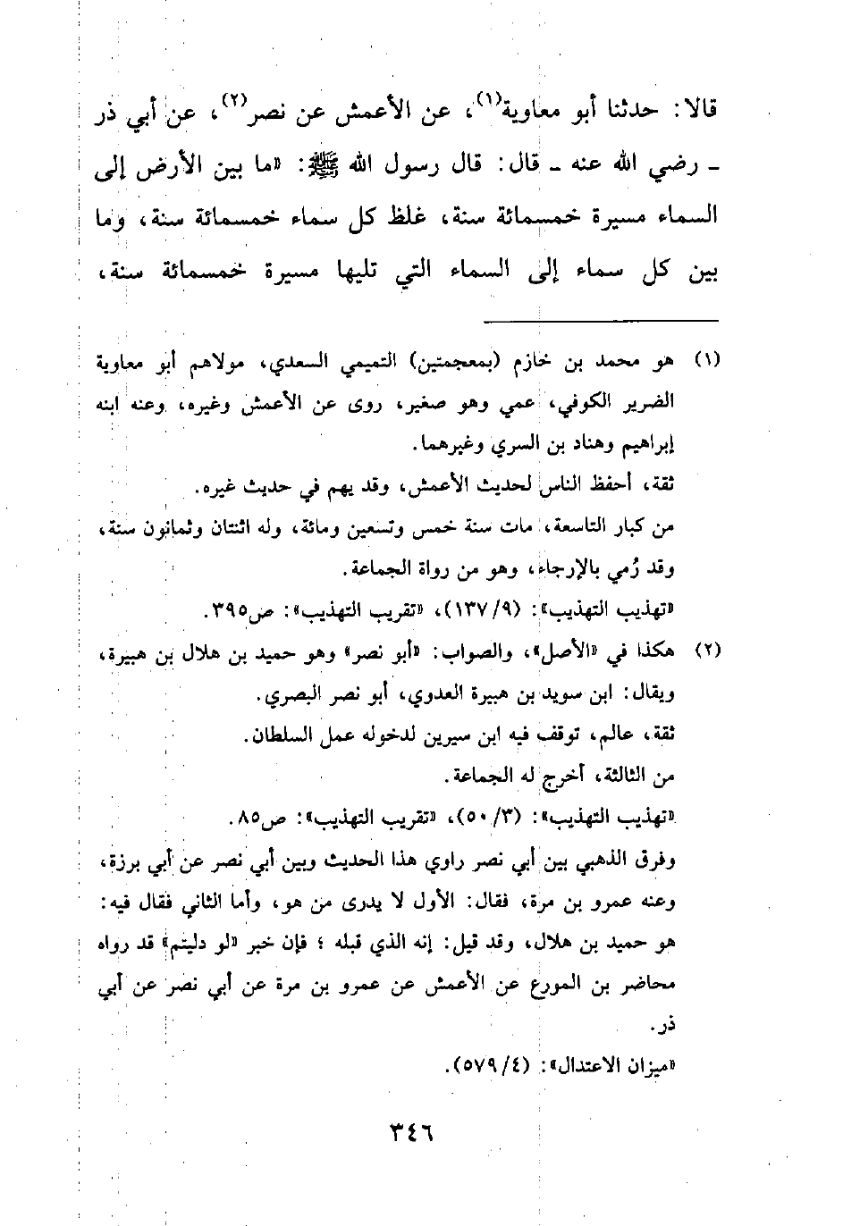 قَالَا: حَدَّثَنَا أَبُو مُعَاوِيَةَ1، عَنِ الْأَعْمَشِ عَنْ نَصْرٍ2، عَنْ أَبِي ذَرٍّ - رَضِيَ اللَّهُ عَنْهُ- قَالَ: قَالَ رَسُولُ اللَّهِ صَلَّى اللَّهُ عَلَيْهِ وَسَلَّمَ: "مَا بَيْنَ الْأَرْضِ إِلَى السَّمَاءِ مَسِيرَةُ خَمْسِمِائَةِ سَنَةٍ، غِلَظُ كُلِّ سَمَاءٍ خَمْسُمِائَةِ سَنَةٍ، وَمَا بَيْنَ كُلِّ سَمَاءٍ إِلَى السَّمَاءِ الَّتِي تَلِيهَا مَسِيرَةُ خَمْسِمِائَة سَنَةٍ،