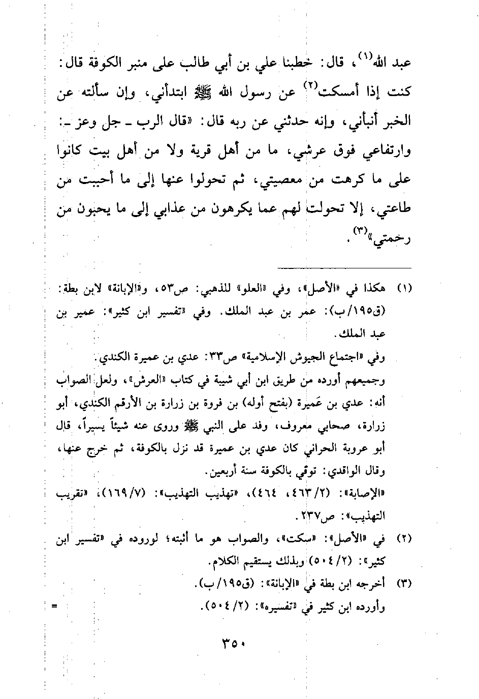 1 هكذا في "الأصل"، وفي "العلو" للذهبي: ص 53، و"الإبانة" لابن بطة: (ق هـ 19/ ب) : عمر بن عبد الملك. وفي "تفسير ابن كثير": عمير بن عبد الملك.