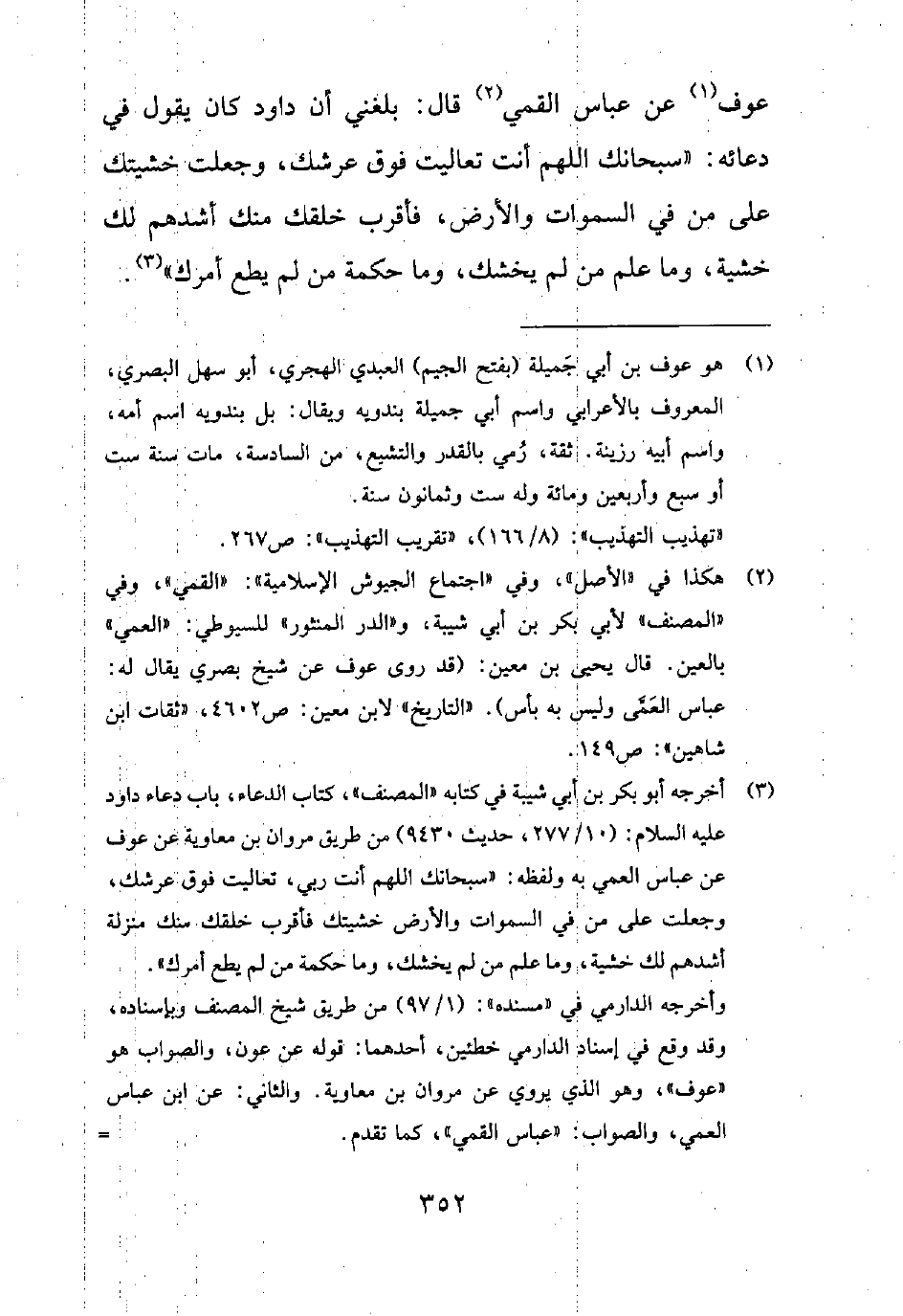 عَوْفٍ1 عَنْ عَبَّاسٍ الْقَمِّيِّ2 قَالَ: بَلَغَنِي أَنَّ دَاوُدَ كَانَ يَقُولُ فِي دُعَائِهِ: "سُبْحَانَكَ اللَّهُمَّ أَنْتَ تَعَالَيْتَ، فَوْقَ عَرْشِكَ، وَجَعَلْتَ خَشْيَتَكَ عَلَى من في السموات وَالْأَرْضِ، فَأَقْرَبُ خَلْقِكَ مِنْكَ أَشَدُّهُمْ لَكَ خَشْيَةً، وَمَا عِلْمُ مَنْ لَمْ يَخْشَكَ، وَمَا حِكْمَةُ مَنْ لَمْ يُطِعْ أمْرَكَ"3.