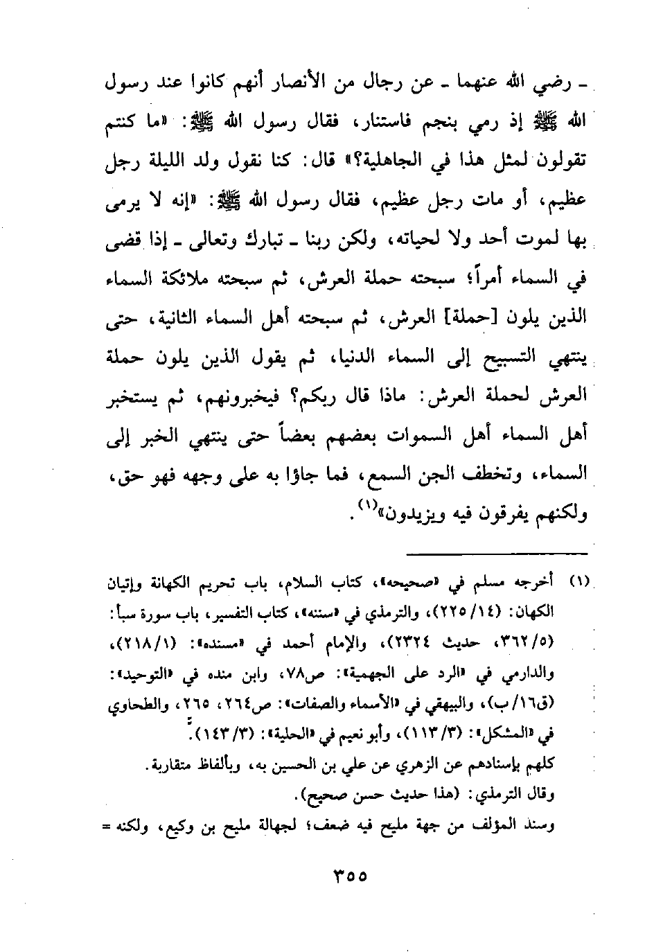 - رضِيَ اللَّهُ عَنْهُمَا- عَنْ رِجَالٍ مِنَ الْأَنْصَارِ أَنَّهُمْ كَانُوا عِنْدَ رَسُولِ اللَّهِ صَلَّى اللَّهُ عَلَيْهِ وَسَلَّمَ إِذْ رُمِيَ بِنَجْمٍ فَاسْتَنَارَ، فَقَالَ رَسُولُ اللَّهِ صَلَّى اللَّهُ عَلَيْهِ وَسَلَّمَ: "مَا كُنْتُمْ تَقُولُونَ لِمِثْلِ هَذَا فِي الْجَاهِليَّةِ؟ " قَالُ: كُنَّا نَقُولُ وُلِدَ اللَّيْلَةَ رَجُلٌ عَظِيمٌ، أَوْ مَاتَ رَجُلٌ عَظِيمٌ، فَقَالَ رَسُولُ اللَّهِ صَلَّى اللَّهُ عَلَيْهِ وَسَلَّمَ: "إِنَّهُ لَا يُرْمَى بِهَا لِمَوْتِ أَحَدٍ وَلَا لِحَيَاتِهِ، وَلَكِنَّ رَبَّنَا- تَبَارَكَ وَتَعَالَى- إِذَا قَضَى فِي السَّمَاءِ أَمْرًا، سَبَّحَتْهُ حَمَلَةُ الْعَرْشِ، ثُمَّ سَبَّحَتْهُ مَلَائِكَةُ السَّمَاءِ الَّذِينَ يَلُونَ حملة الْعَرْشَ، ثُمَّ سَبَّحَتْهُ أَهْلُ السَّمَاءِ الثَّانِيَةِ، حَتَّى يَنْتَهِيَ التَّسْبِيحُ إِلَى السَّمَاءِ الدُّنْيَا، ثُمَّ يَقُولُ الَّذِينَ يَلُونَ حَمَلَةَ الْعَرْشِ لِحَمَلَةِ الْعَرْشِ: مَاذَا قَالَ رَبُّكُمْ، فَيُخْبِرُونَهُمْ، ثُمَّ يَسْتَخْبِرُ أَهْلُ السماء أهل السموات بَعْضُهُمْ بَعْضًا حَتَّى يَنْتَهِيَ الْخَبَرُ إِلَى السَّمَاءِ، وَتَخْطَفُ الْجِنُّ السمع، فما جاؤا بِهِ عَلَى وَجْهِهِ فَهُوَ حَقٌّ، وَلَكِنَّهُمْ يفْرقُونَ فِيهِ وَيَزِيدُونَ" 1.