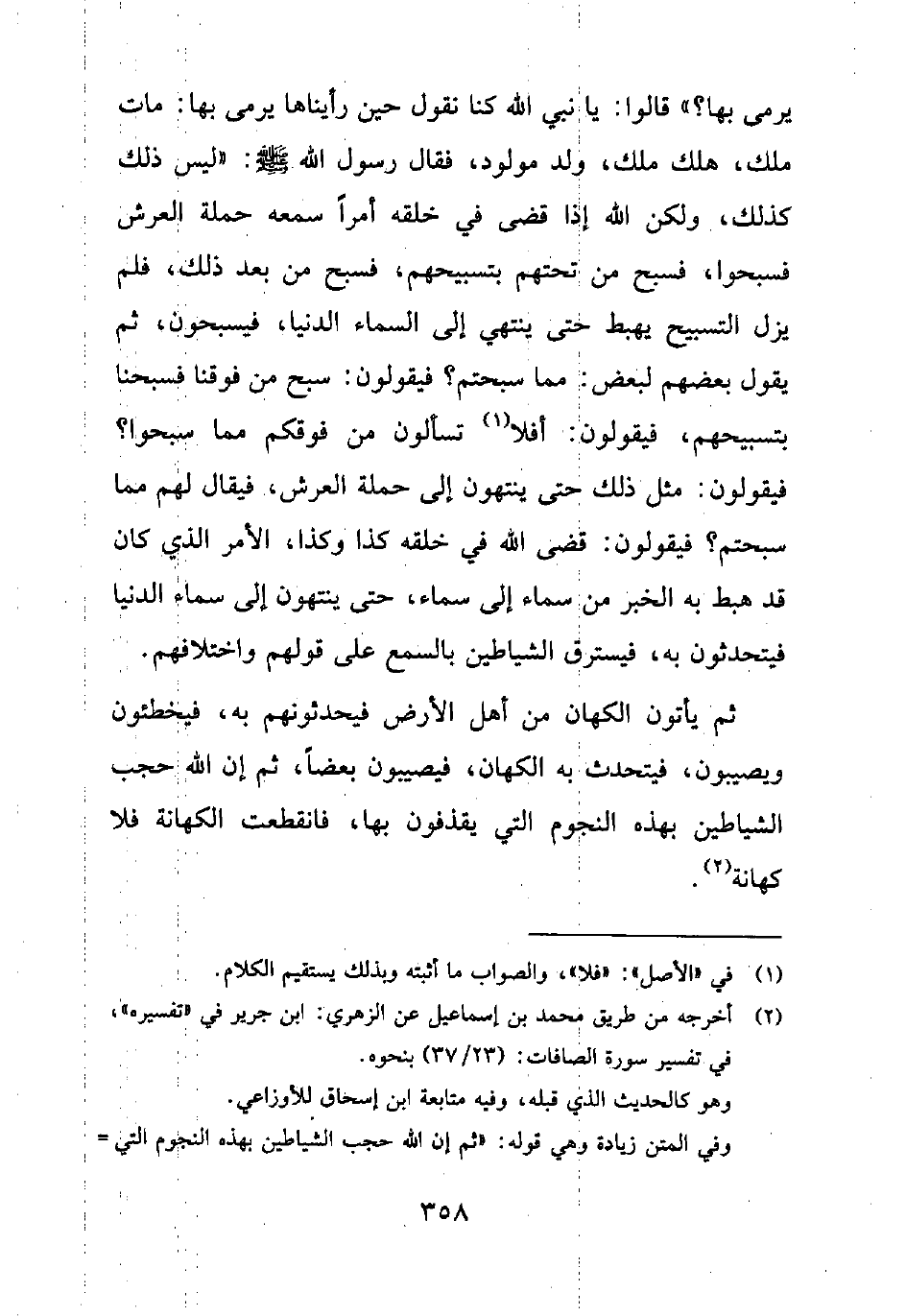 يُرْمَى بِهَا؟ " قَالُوا: يَا نَبِيَّ اللَّهِ كُنَّا نَقُولُ حِينَ رَأَيْنَاهَا يُرْمَى بِهَا: مَاتَ مَلِكٌ، هَلَكَ مَلِكٌ، وُلِدَ مَوْلُودٌ، فَقَالَ رَسُولُ اللَّهِ صَلَّى اللَّهُ عَلَيْهِ وَسَلَّمَ: "لَيْسَ ذَلِكَ كَذَلِكَ، وَلَكِنَّ اللَّهَ إِذَا قَضَى فِي خَلْقِهِ أَمْرًا سَمِعَهُ حَمَلَةُ الْعَرْشِ فَسَبَّحُوا، فَسَبَّحَ مَنْ تَحْتَهُمْ بِتَسْبِيحِهِمْ، فَسَبَّحَ مَنْ بَعْدَ ذَلِكَ، فَلَمْ يَزَلِ التَّسْبِيحُ يَهْبِطُ حَتَّى يَنْتَهِيَ إِلَى السَّمَاءِ الدُّنْيَا، فَيُسَبِّحُونَ، ثُمَّ يَقُولُ بعضهم لبعض: مما سَبَّحْتُمْ، فَيَقُولُونَ: سَبَّحَ مَنْ فَوْقَنَا فَسَبَّحْنَا بِتَسْبِيحِهِمْ، فَيَقُولُونَ: أَفَلَا1 تَسْأَلُونَ من فوقكم مما سَبَّحُوا، فَيَقُولُونَ: مِثْلَ ذَلِكَ حَتَّى يَنْتَهُونَ إِلَى حَمَلَةِ الْعَرْشِ، فيقال لهم مما سَبَّحْتُمْ، فَيَقُولُونَ: قَضَى اللَّهُ فِي خَلْقِهِ كَذَا وَكَذَا، الْأَمْرَ الَّذِي كَانَ قَدْ هَبَطَ بِهِ الْخَبَرُ مِنْ سَمَاءٍ إِلَى سَمَاءٍ، حَتَّى يَنْتَهُونَ إِلَى سَمَاءِ الدُّنْيَا فَيَتَحَدَّثُونَ بِهِ، فَيَسْتَرِقُ الشَّيَاطِينُ بِالسَّمْعِ عَلَى قَوْلِهِمْ وَاخْتِلَافِهِمْ ثُمَّ يَأْتُونَ الْكُهَّانَ مِنْ أَهْلِ الْأَرْضِ فَيُحَدِّثُونَهُمْ بِهِ، فَيُخْطِئونَ وَيُصيبُونَ، فَيَتَحَدَّثُ بِهِ الْكُهَّانُ، فَيُصِيبُونَ بَعْضًا، ثُمَّ إِنَّ اللَّهَ حَجَبَ الشَّيَاطِينَ بِهَذِهِ النُّجُومِ الَّتِي يُقْذَفُونَ بِهَا، فَانْقَطَعَتِ الْكِهَانَةُ فَلَا كِهَانَةَ"2.