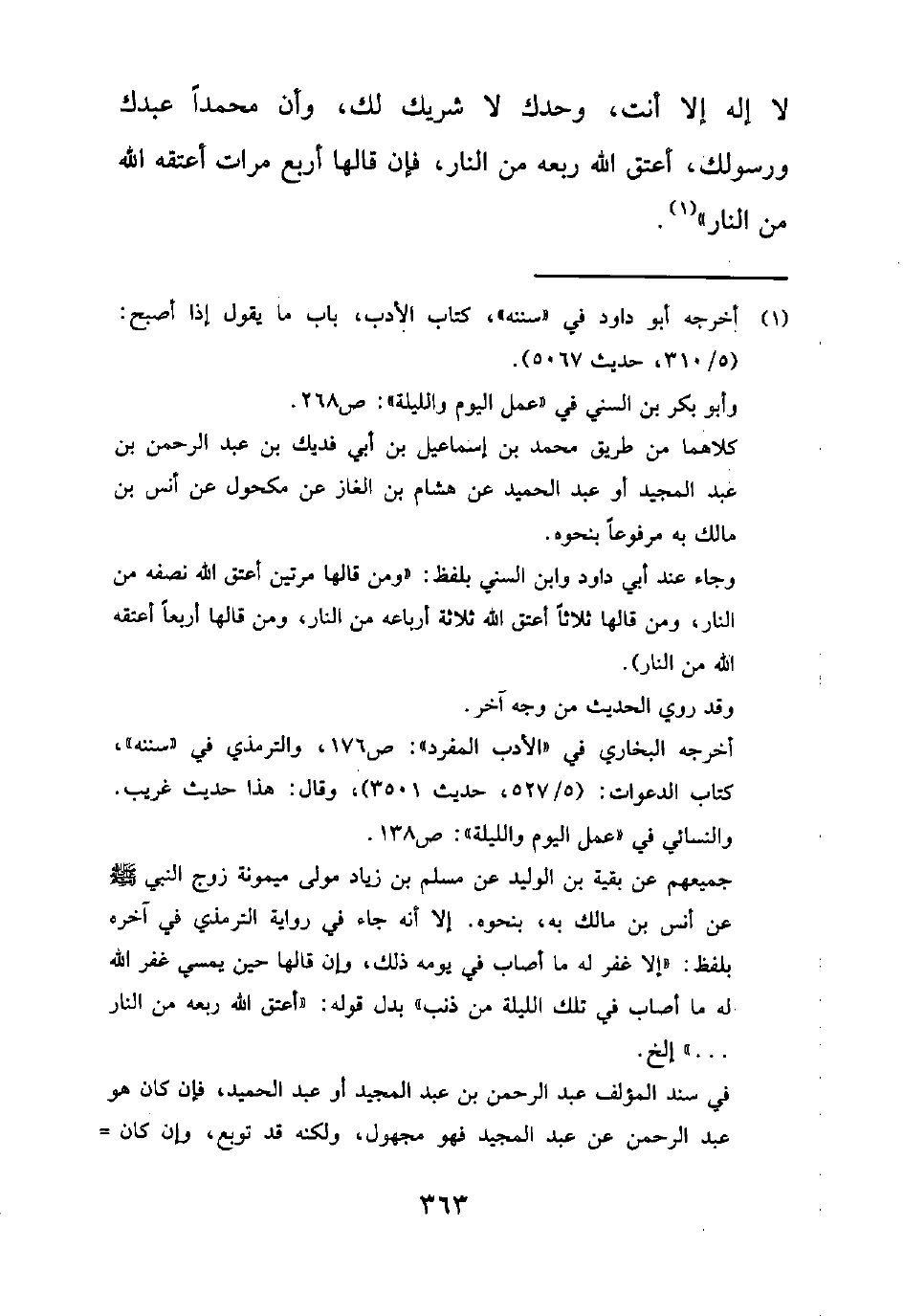 لَا إِلَهَ إِلَّا أَنْتَ، وَحْدَكَ لَا شَرِيكَ لَكَ، وَأَنَّ مُحَمَّدًا عَبْدُكَ وَرَسُولُكَ، أُعْتِقَ اللَّهُ رُبُعَهُ مِنَ النَّارِ، فَإِنْ قَالَهَا أَرْبَعَ مَرَّاتٍ أَعْتَقَهُ اللَّهُ مِنَ النَّارِ" 1.