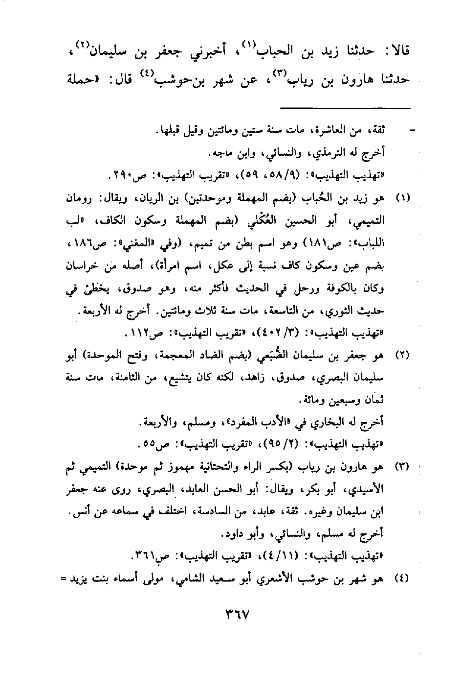 قَالَا: حَدَّثَنَا زَيْدُ بْنُ الْحُبَابِ1، أَخْبَرَنِي جَعْفَرُ بْنُ سُلَيْمَانَ2، حَدَّثَنَا هارون بن رياب3، عَنْ شَهْرِ بْنِ حَوْشَبٍ4 قَالَ: "حَمَلَةُ
