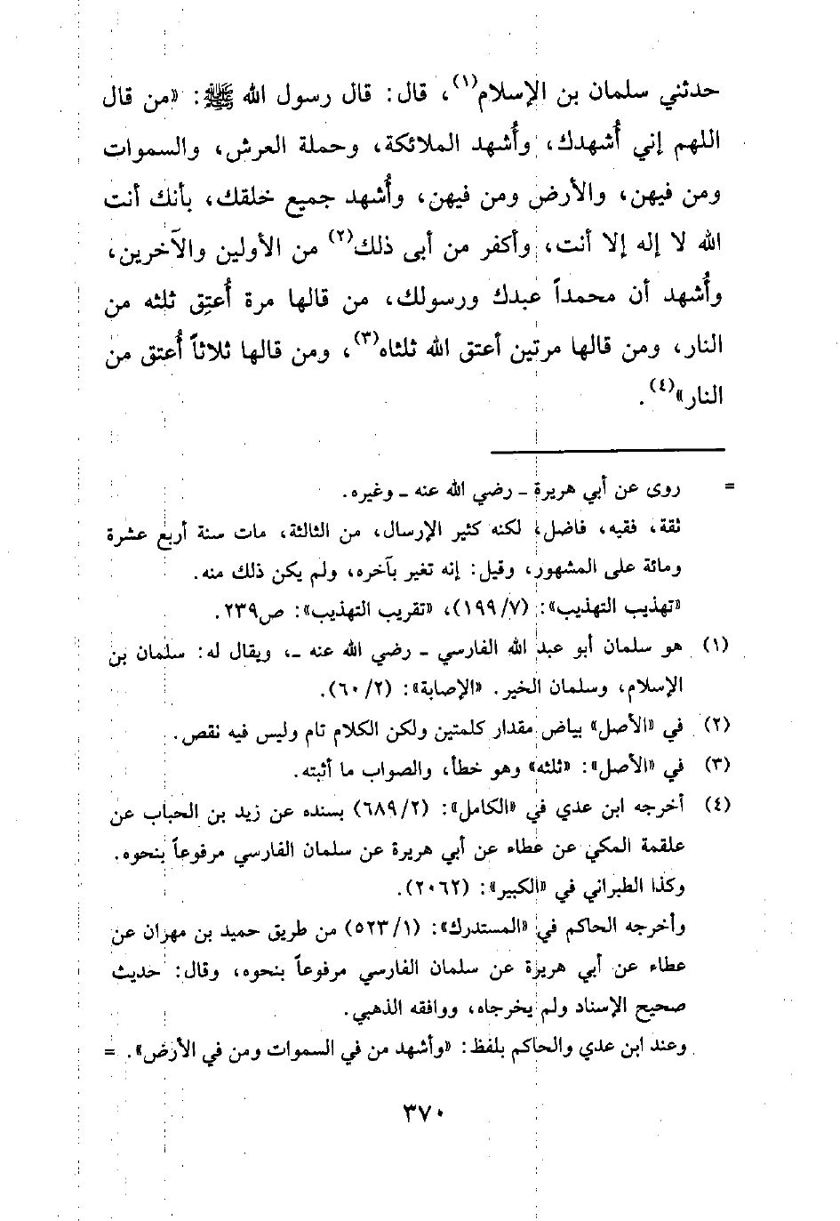 حَدَّثَنِي سَلْمَانُ ابْنُ الإسلام1، قال- قالا رَسُولُ صَلَّى اللَّهُ عَلَيْهِ وَسَلَّمَ: "مَنْ قَالَ اللَّهُمَّ إِنِّي أُشْهِدُكَ، وَأُشْهِدُ الْمَلَائِكَةَ وحملة العرش، والسموات وَمَنْ فِيهِنَّ، وَالْأَرْضَ وَمَنْ فِيهِنَّ، وَأُشْهِدُ جَمِيعَ خَلْقِكَ، بِأَنَّكَ أَنْتَ اللَّهُ لَا إِلَهَ إِلَّا أَنْتَ، وَأُكَفِّرُ مَنْ أَبَى ذَلِكَ2 مِنَ الْأَوَّلِينَ وَالْآخِرِينَ، وَأَشْهَدُ أَنَّ مُحَمَّدًا عَبْدُكَ وَرَسُولُكَ، مَنْ قَالَهَا مَرَّةً أَعْتَقَ ثُلُثَهُ مِنَ النَّارِ، وَمَنْ قَالَهَا مَرَّتَيْنِ أعتق الله ثلثاه3، مِنَ قَالَهَا ثَلَاثًا أُعْتِقَ مِنَ النَّارِ" 4.