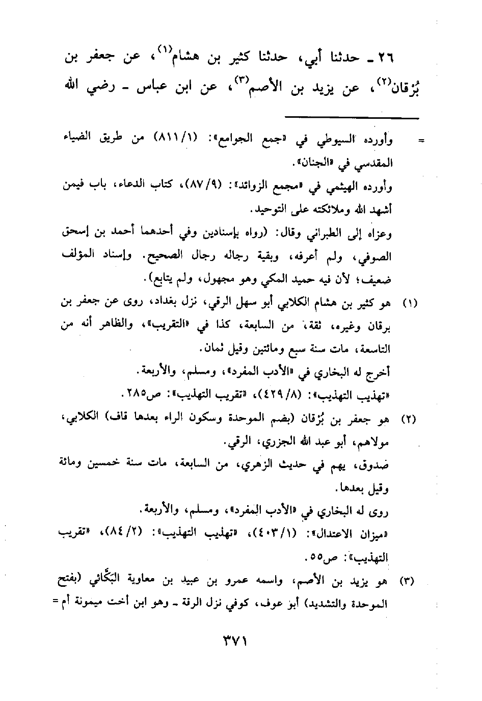 26- حَدَّثَنَا أَبِي، حَدَّثَنَا كَثِيرُ بْنُ هِشَامٍ1، عَنْ جَعْفَرِ بْنِ بُرْقَانَ2، عَنْ يَزِيدَ بْنِ الْأَصَمِّ3، عَنِ ابْنِ عَبَّاسٍ- رَضِيَ اللَّهُ