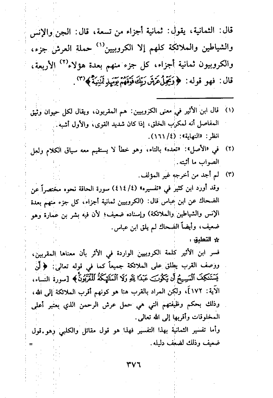 قَالَ: الثَّمَانِيَةُ، يَقُولُ: ثَّمَانِيَةُ أَجْزَاءٌ مِنْ تِسْعَةٍ، قَالَ: الْجِنُّ وَالْإِنْسُ وَالشَّيَاطِينُ وَالْمَلَائِكَةُ كُلُّهُمْ إِلَّا الْكَرُوبِيِّينَ1 حَمَلَةُ الْعَرْشِ جُزْءٌ، وَالْكَرُوبِيُّونَ ثَمَانِيَةُ أَجْزَاءٍ، كُلُّ جُزْءٍ مِنْهُمْ بِعُدَّةِ هَؤُلَاءِ2 الْأَرْبَعَةِ، قَالَ: فَهُوَ قَوْلُهُ: {وَيَحْمِلُ عَرْشَ رَبِّكَ فَوْقَهُمْ يَوْمَئِذٍ ثَمَانِيَةٌ} 3.