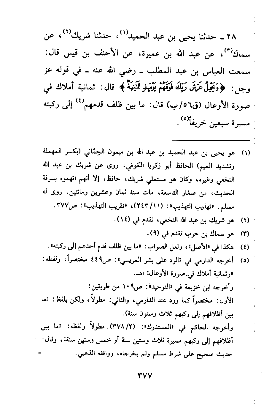 28- حَدَّثَنَا يَحْيَى بْنُ عَبْدِ الْحَمِيدِ1، حَدَّثَنَا شَرِيكٌ2، عَنْ سِمَاكٍ3، عَنْ عَبْدِ اللَّهِ بْنِ عُمَيْرَةَ، عَنِ الْأَحْنَفِ بْنِ قَيْسٍ قَالَ: سَمِعْتُ الْعَبَّاسَ بْنَ عَبْدِ الْمُطَّلِبِ- رَضِيَ اللَّهُ عَنْهُ- فِي قَوْلِهِ عَزَّ وَجَلَّ: {وَيَحْمِلُ عَرْشَ رَبِّكَ فَوْقَهُمْ يَوْمَئِذٍ ثَمَانِيَةٌ} قَالَ: ثَمَانِيَةُ أَمْلَاكٍ فِي صورة الأوعال (ق 56/ ب) قَالَ: مَا بَيْنَ ظِلْفِ قَدَمِهِمْ4 إِلَى رُكْبَتِهِ مَسِيرَةُ سَبْعِينَ خَرِيفًا"5.