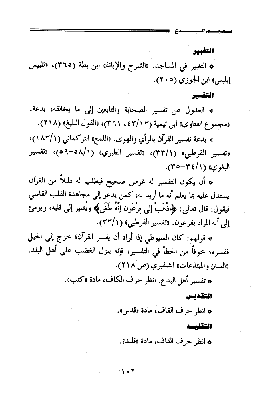 • العدول عن تفسير الصحابة والتابعين إلى ما يخالفه، بدعة. "مجموع الفتاوى" ابن تيمية (13/ 43، 361)، "القول البليغ" (218).