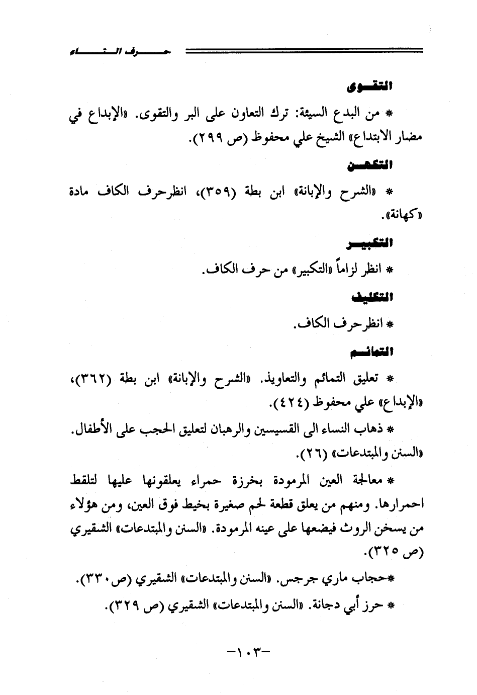 • تعليق التمائم والتعاويذ. "الشرح والإبانة" ابن بطة (362)، "الإبداع" علي محفوظ (424).