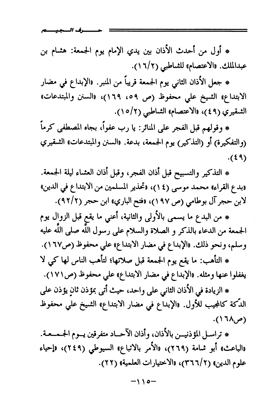 • تراسل المؤذنين بالأذان، وأذان الآحاد متفرقين يوم الجمعة. "الباعث" أبو شامة (269)، "الأمر بالاتباع" السيوطي (249)، "إحياء علوم الدين" (2/ 366)، "الاختيارات العلمية" (22).