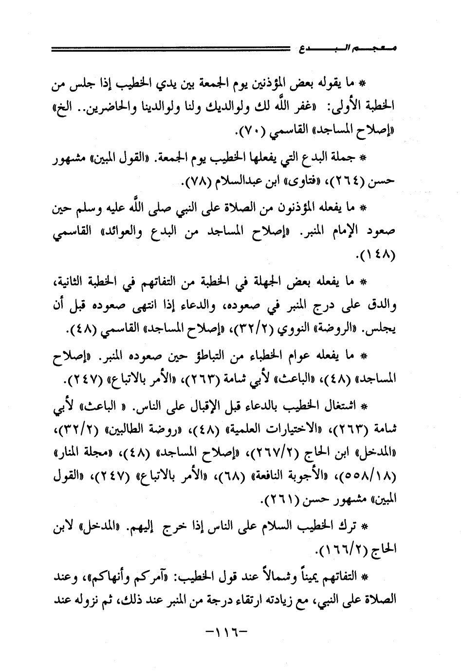 • جملة البدع التي يفعلها الخطيب يوم الجمعة. "القول المبين" مشهور حسن (264)، "فتاوى" ابن عبد السلام (78).