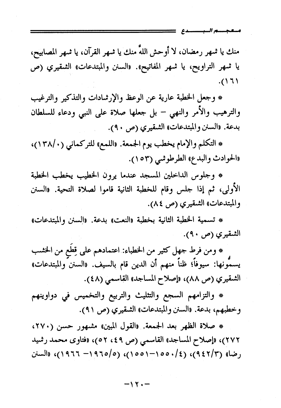 • وجعل الخطبة عارية عن الوعظ والإرشادات والتذكير والترغيب والترهيب والأمر والنهي - بل جعلها صلاة على النبي ودعاء للسلطان بدعة. "السنن والمبتدعات" الشقيري (ص 90).