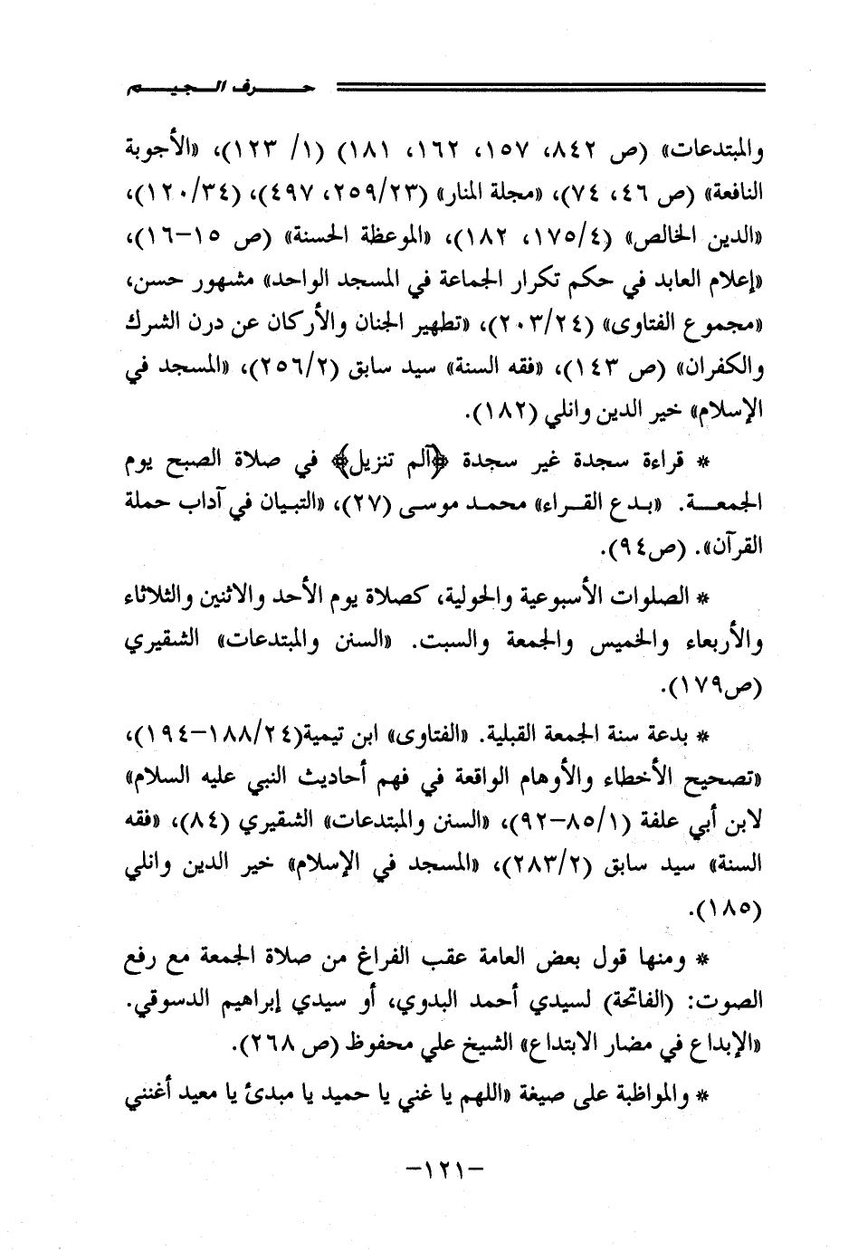 • قراءة سجدة غير سجدة {الم تَنْزِيْلُ} في صلاة الصبح يوم الجمعة. "بدع القراء" محمد موسى (27)، "التبيان في آداب حملة القرآن". (ص 94).