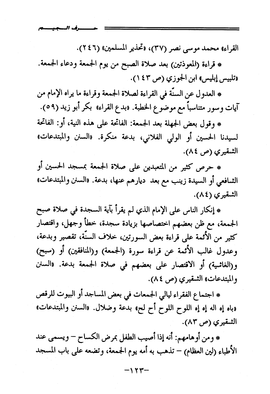 • إنكار الناس على الإمام الذي لم يقرأ بآية السجدة في صلاة صبح الجمعة، مع ظن بعضهم اختصاصها بزيادة سجدة، خطأ وجهل، واقتصار كثير من الأئمة على قراءة بعض السورتين، خلاف السنّة، تقصير وبدعة، وعدول غالب الأئمة عن قراءة سورة (الجمعة) و (المنافقين) أو (سبح) و (الغاشية) أو الاقتصار على بعضهم في صلاة الجمعة بدعة. "السنن و"المبتدعات" الشقيري (ص 84).