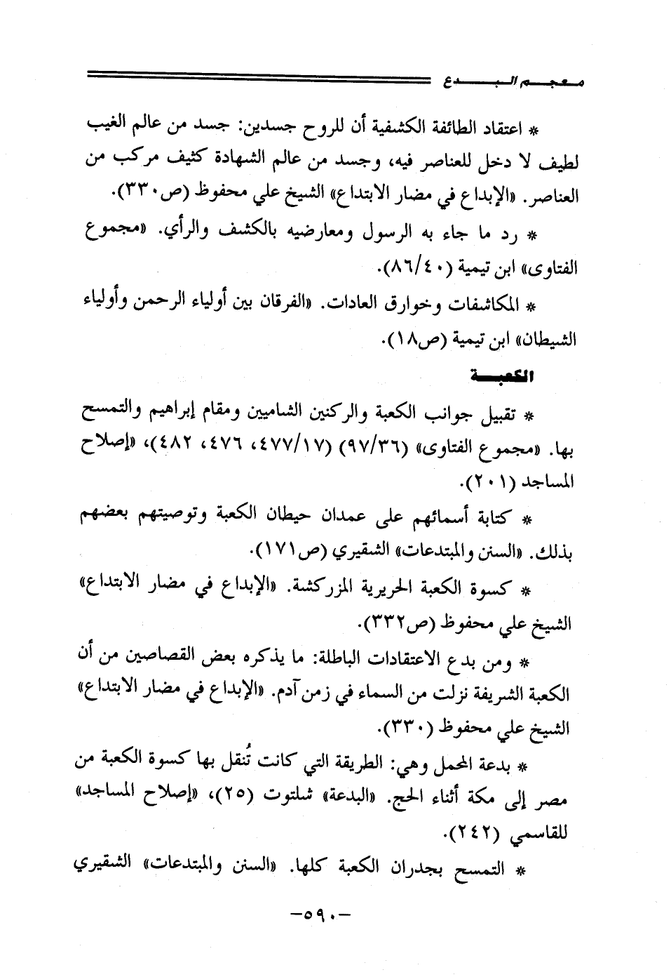 • ومن بدع الاعتقادات الباطلة: ما يذكره بعض القصاصين من أن الكعبة الشريفة نزلت من السماء في زمن آدم. "الإبداع في مضار الإبتداع" الشيخ علي محفوظ (330).