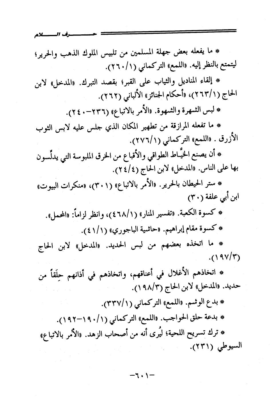 • ستر الحيطان بالحرير. "الأمر بالإتباع" (301)، "منكرات البيوت" ابن أبي علفة (30)